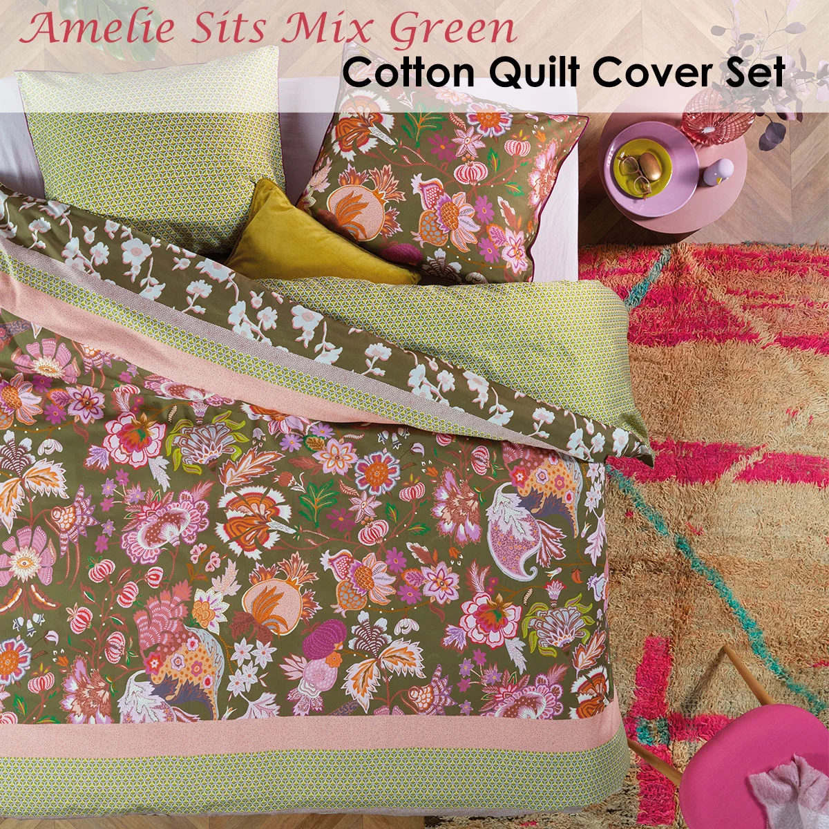 The Amelie Sits Mix Green Cotton Sateen Quilt Cover Set by Oilily has a contemporary and trendy striped design. The top and bottom bands comprise light pink flowers on a green background. The centre is dominated by a print of colourful graphic flowers and foliage on the same green background. This print is interrupted by bands featuring a graphic print in pastel colour tones of blush, sky, green, white, yellow, grey, black, purple, teal, and blue. The pillowcases have the same print as the middle section of the duvet cover and feature purple cord piping. The back of the pillow cases and the duvet cover has the same pastel green graphic print as one of the bands on the front of the duvet cover.