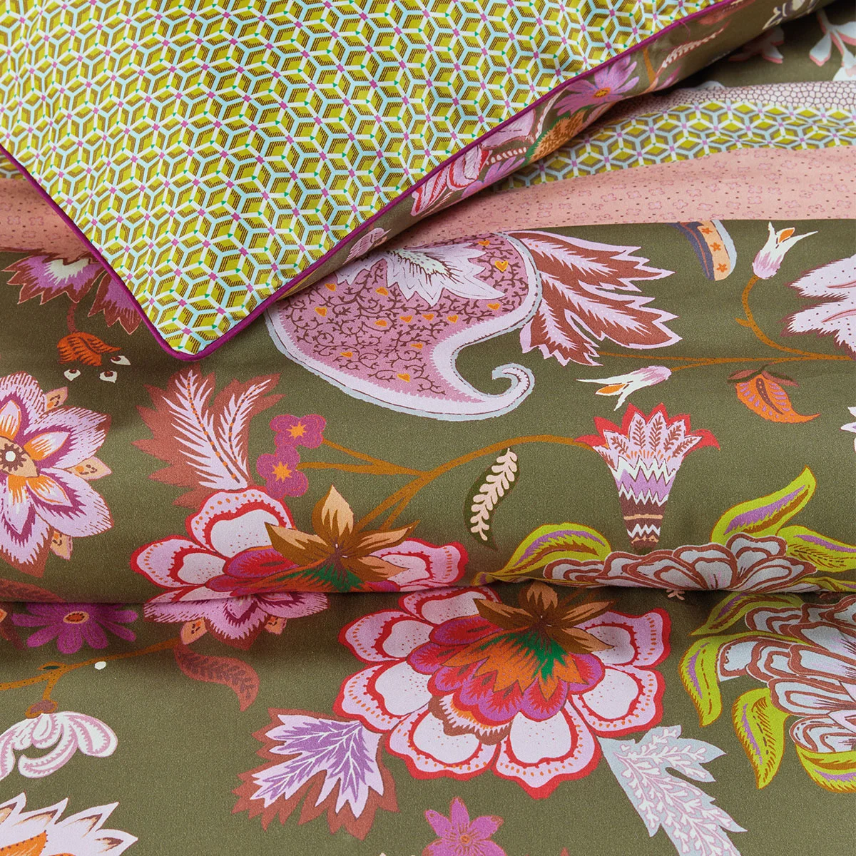 The Amelie Sits Mix Green Cotton Sateen Quilt Cover Set by Oilily has a contemporary and trendy striped design. The top and bottom bands comprise light pink flowers on a green background. The centre is dominated by a print of colourful graphic flowers and foliage on the same green background. This print is interrupted by bands featuring a graphic print in pastel colour tones of blush, sky, green, white, yellow, grey, black, purple, teal, and blue. The pillowcases have the same print as the middle section of the duvet cover and feature purple cord piping. The back of the pillow cases and the duvet cover has the same pastel green graphic print as one of the bands on the front of the duvet cover.