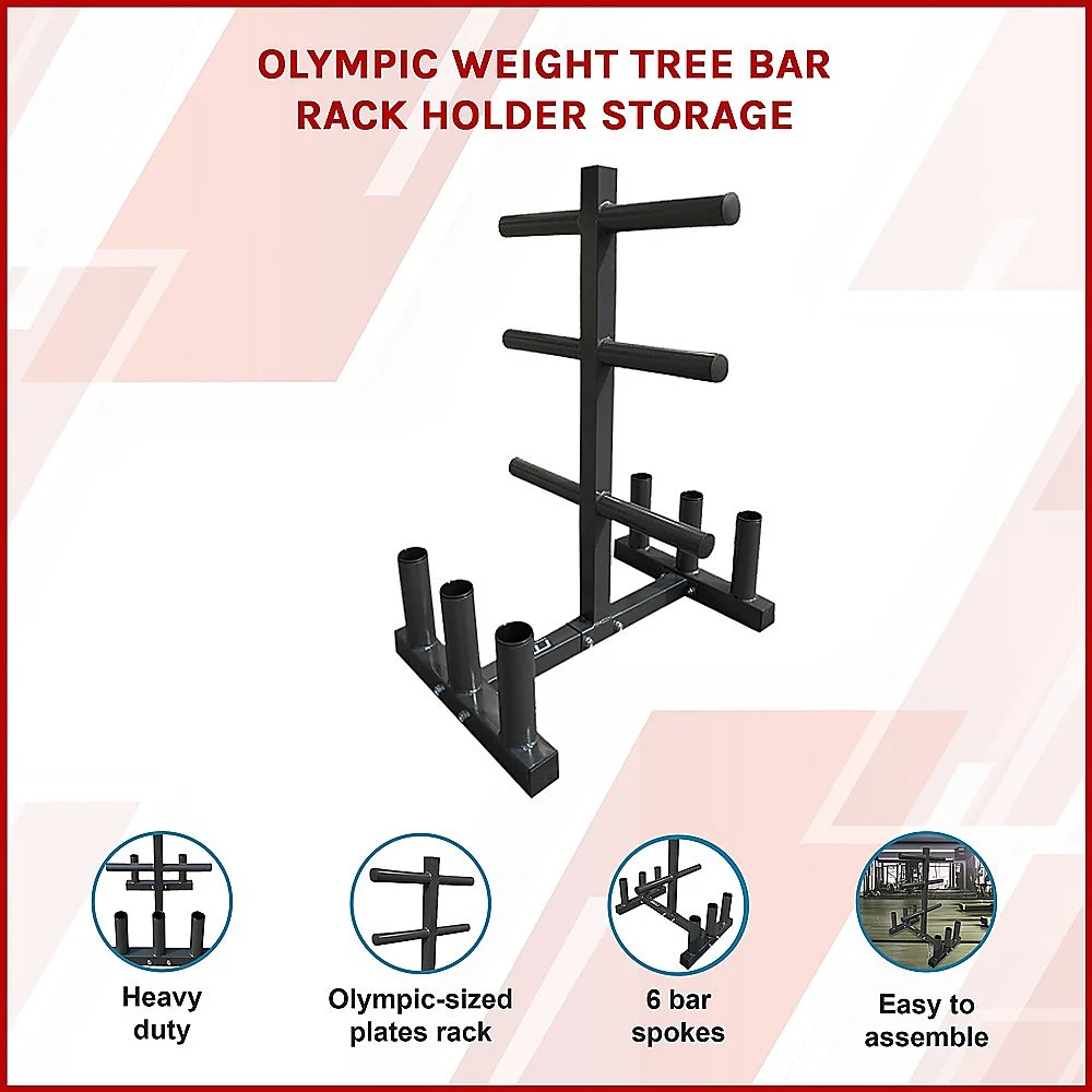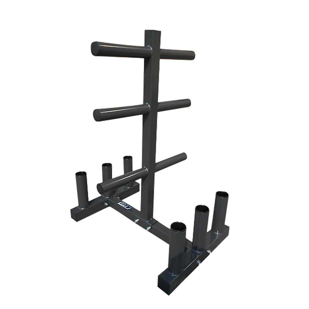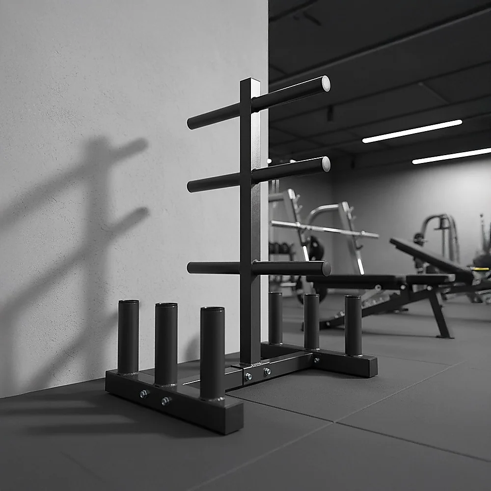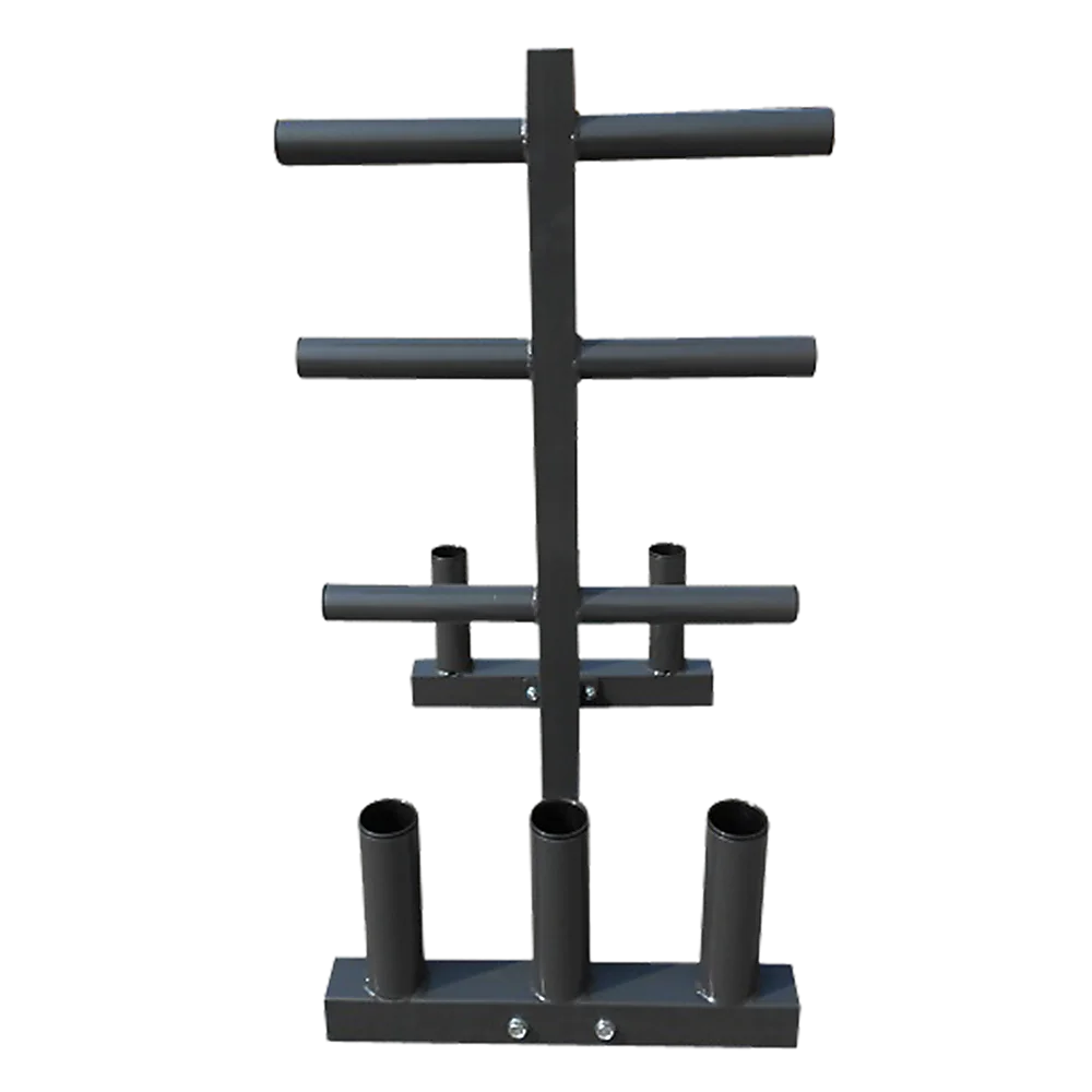 The rack accommodates Olympic-sized 51mm weight plates and 50mm Olympic bars. There is room for multiple plates on each of six weight plate spokes. Even better, six additional outside spokes give you a convenient place to store standard-sized gym bars.