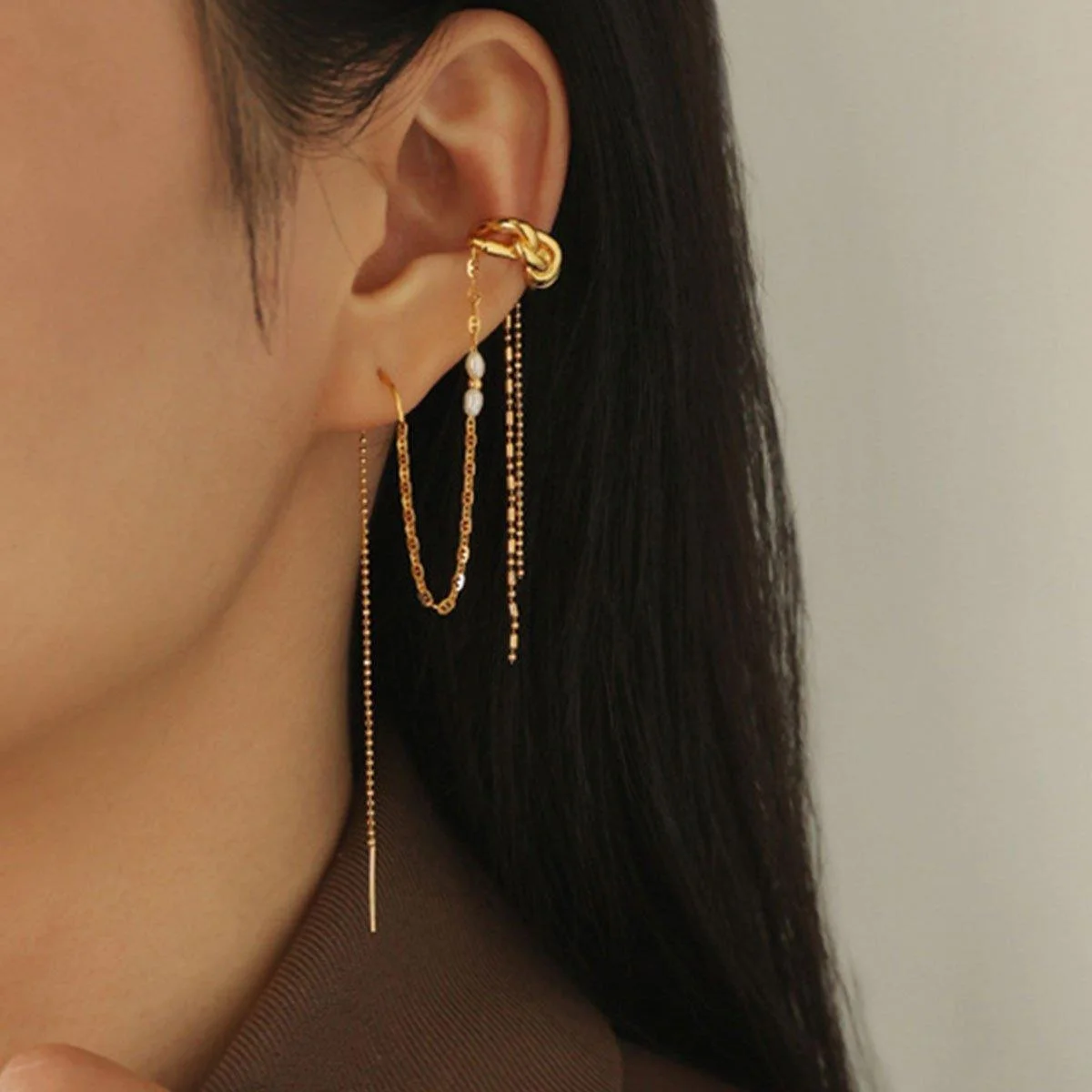 This elegant ear piece is designed to offer a chic and sophisticated look with its unique wrap-around style and pearl accent. Its one-piece design wraps around the ear bone, making it a stylish accessory for any occasion. Please note, this is not a pair, but a single earring, ideal for those who love mixing and matching or prefer asymmetrical jewellery designs. The delicate chain details and shimmering gold colour add a touch of glamour to your outfit, while the pearl brings a timeless elegance.