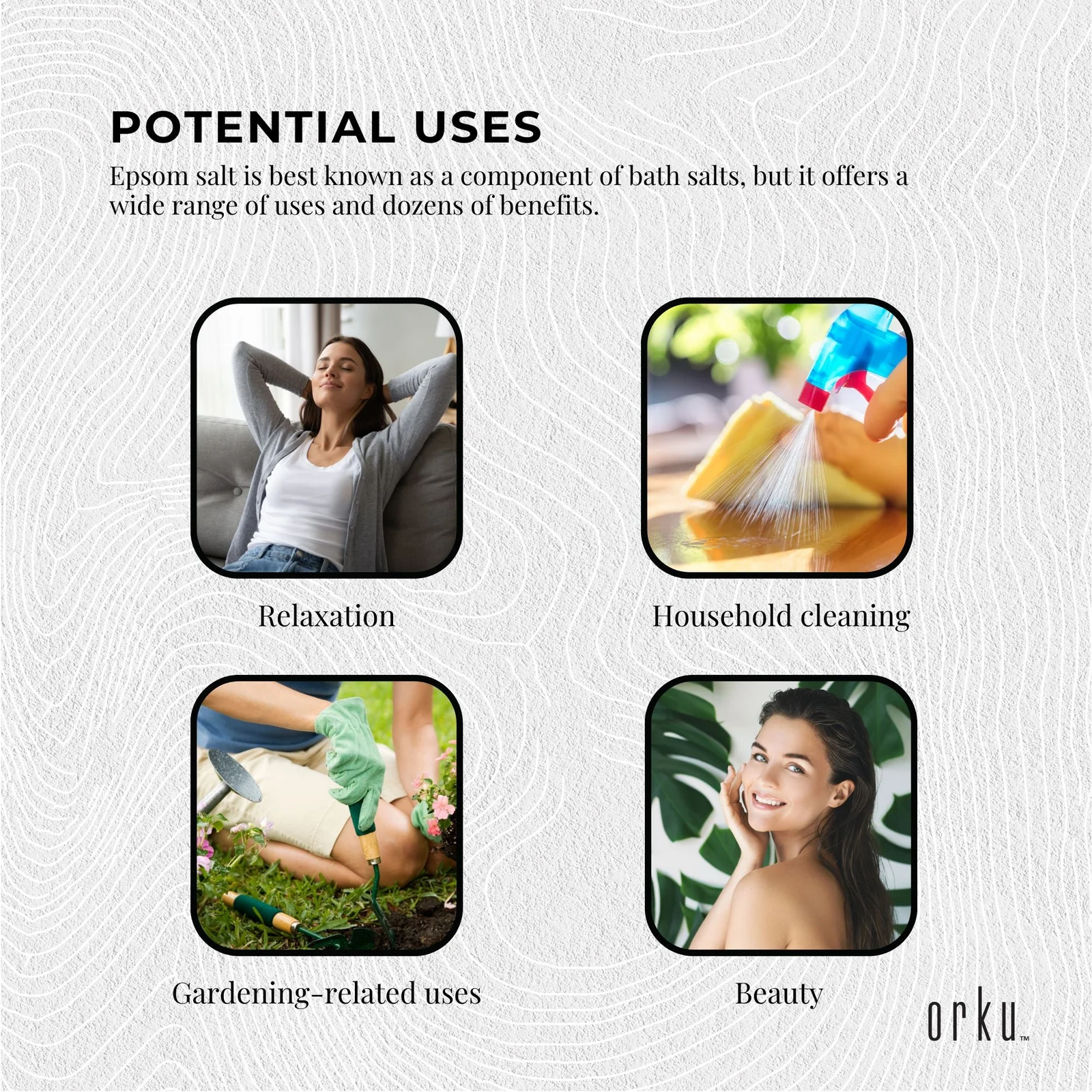 Epsom salt (Magnesium Sulfate / Sulphate) is best known as a component of bath salts, but it offers a wide range of uses and dozens of benefits, from relaxation, improving a gardener’s crops to household cleaning, and more.