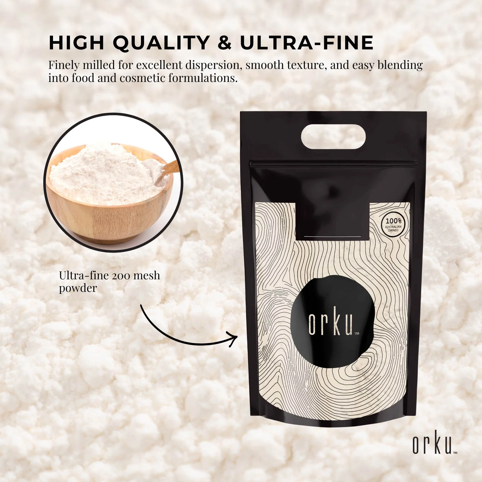- High Quality and Ultra Fine 200 Mesh: Finely milled for excellent dispersion, smooth texture, and easy blending into food and cosmetic formulations.