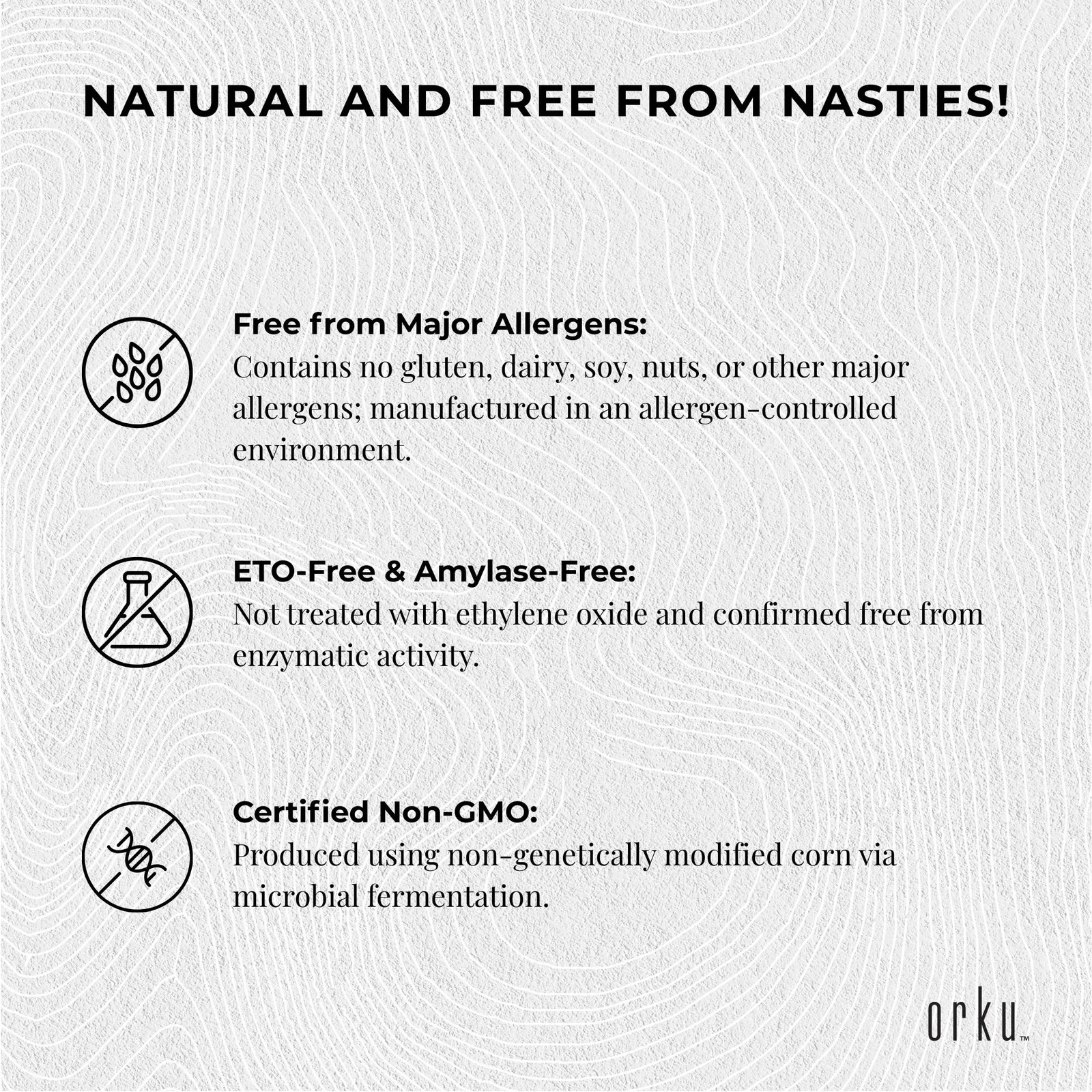 - ETO-Free Amylase-Free: Not treated with ethylene oxide and confirmed free from enzymatic activity.