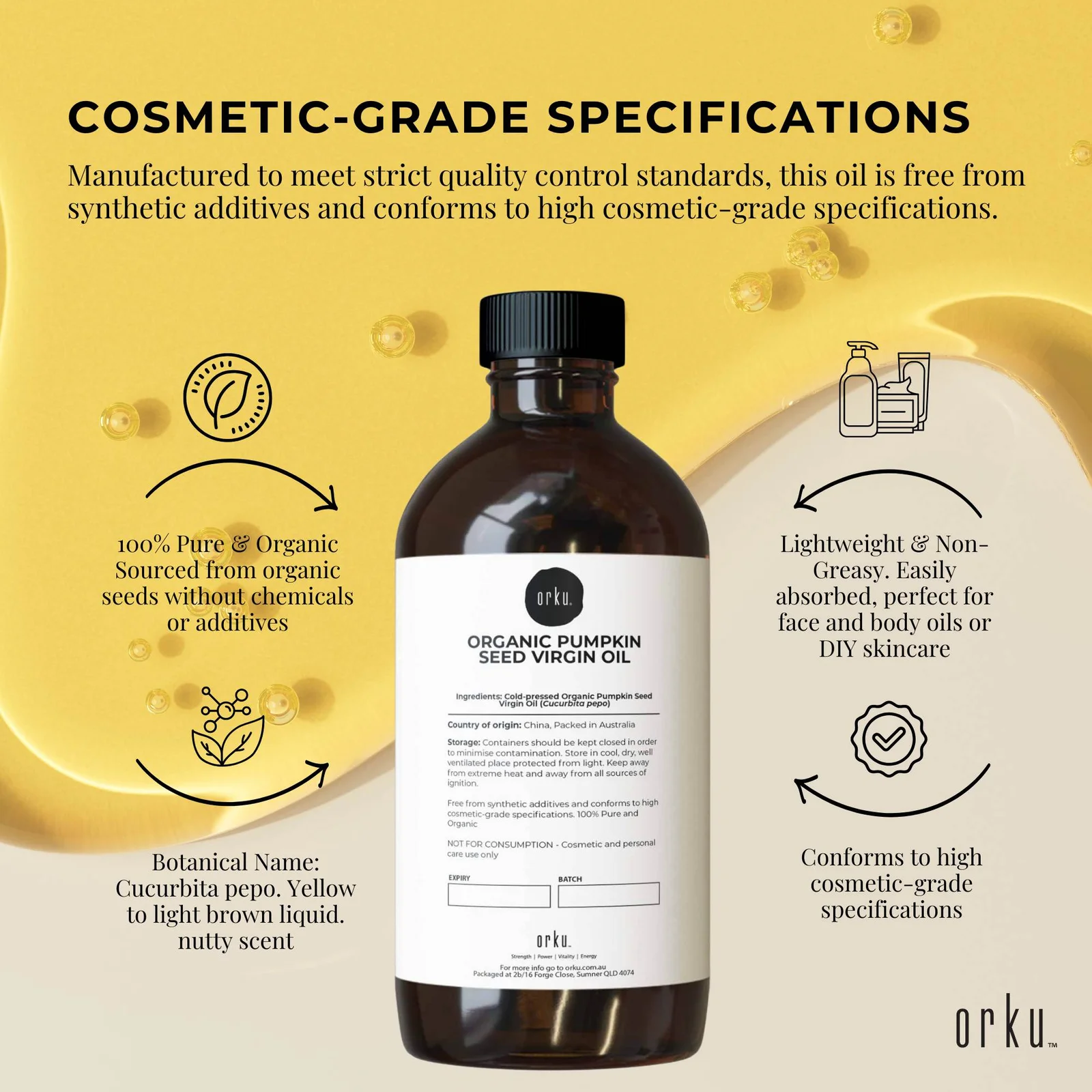 Manufactured to meet strict quality control standards, this oil is free from synthetic additives and conforms to high cosmetic-grade specifications.