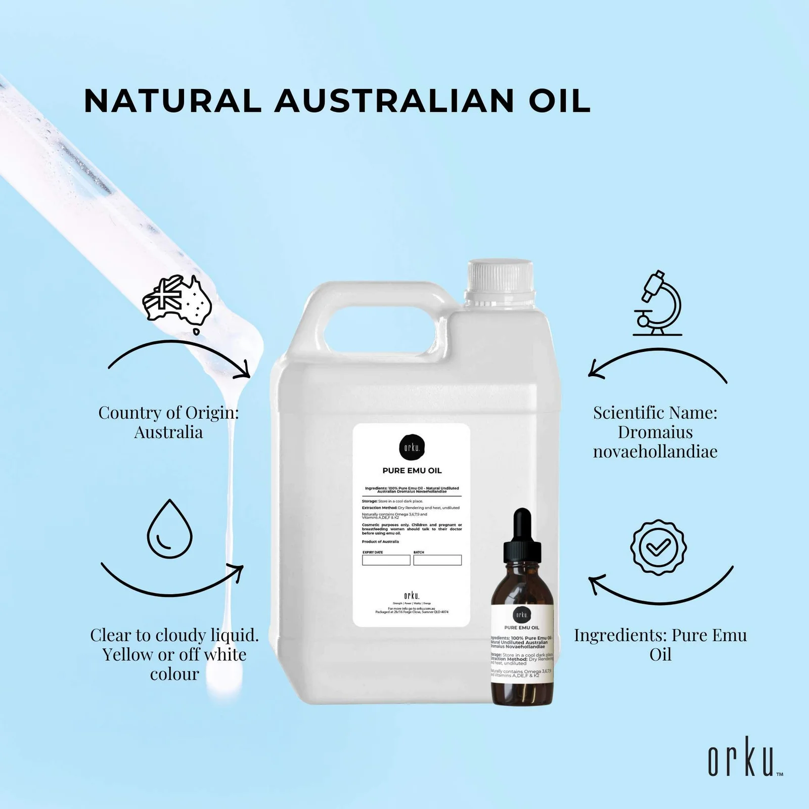 With its potent blend of essential fatty acids and vitamins, Orku Emu Oil has undergone specific heat treatment and testing to ensure its quality and safety of use in cosmetic products and for a myriad of applications. For added convenience, we have included a 25ml empty dropper bottle to assist with use.