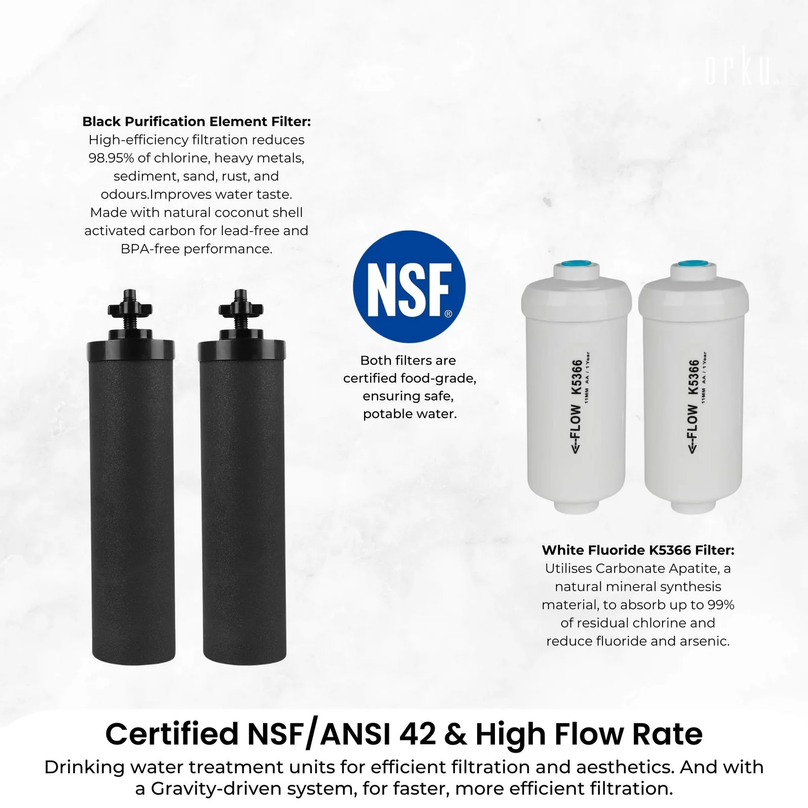 White Fluoride K5366 Filter: Utilises Carbonate Apatite, a natural mineral synthesis material, to absorb up to 99% of residual chlorine and reduce fluoride and arsenic. Both filters are certified food-grade, ensuring safe, potable water.