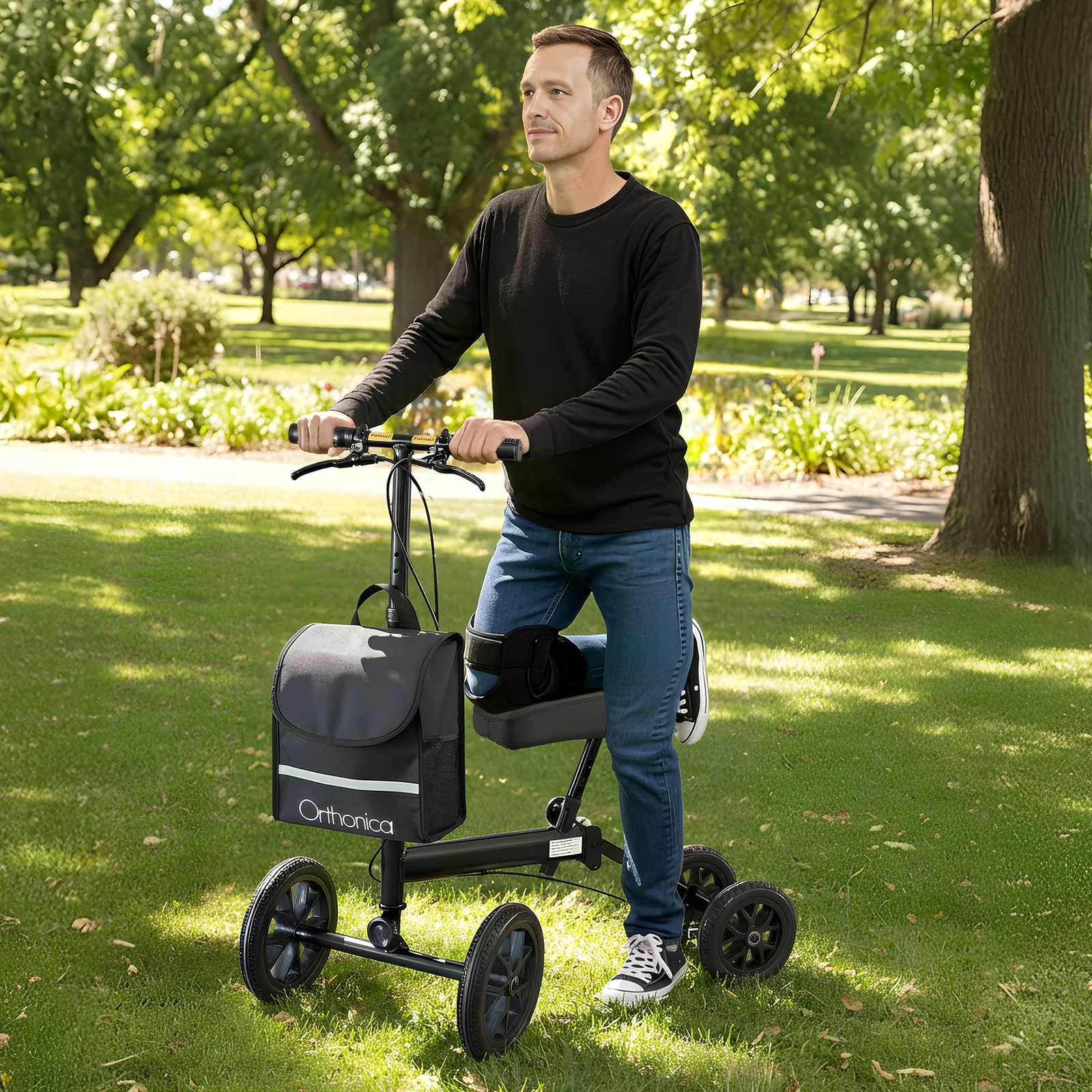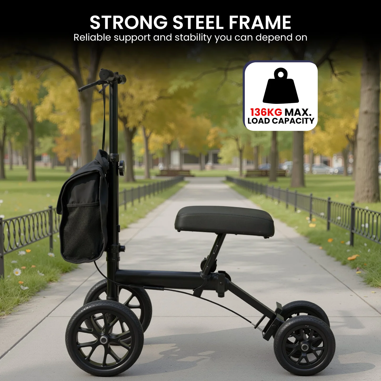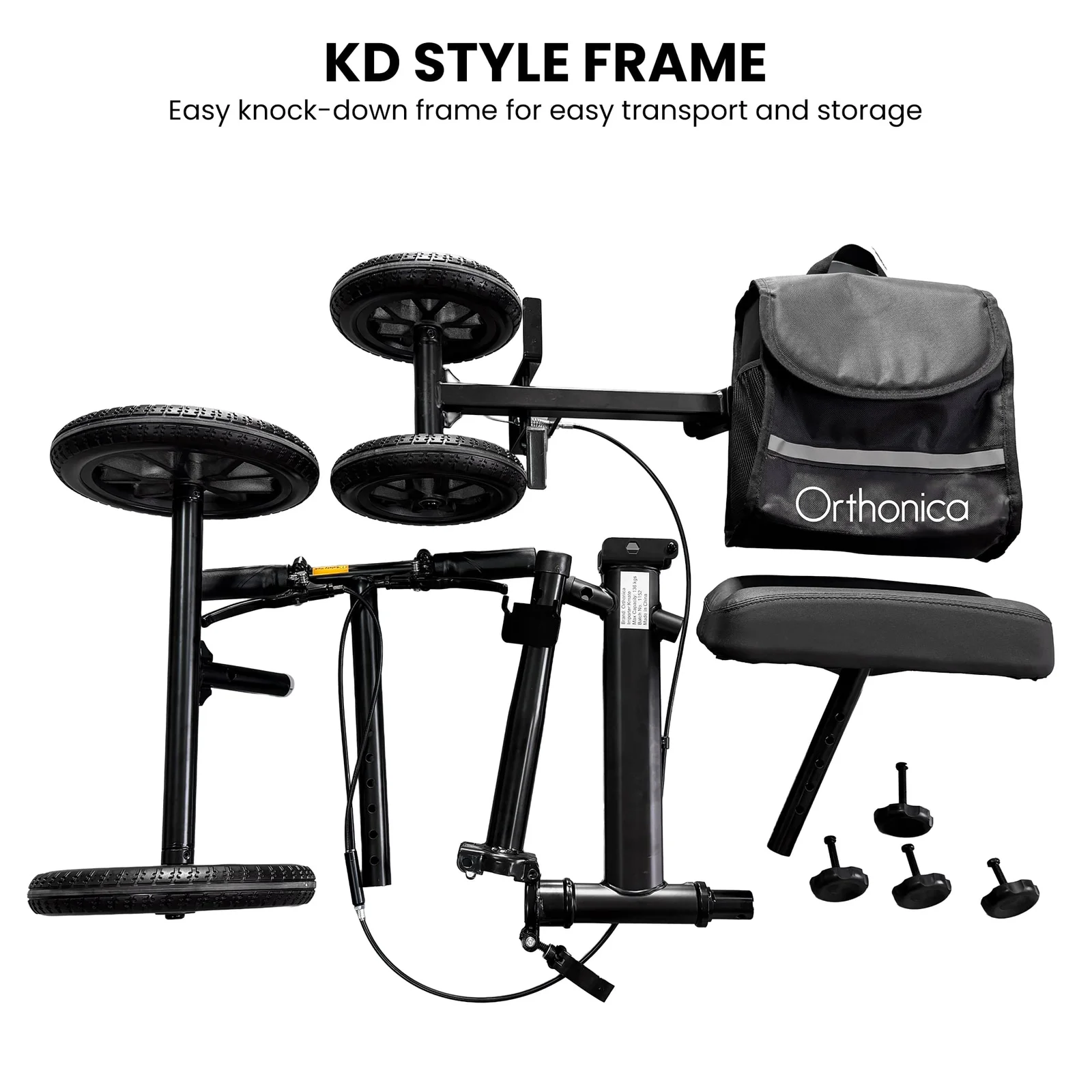 When mobility matters most, this dependable knee walker can make tasks feel more manageable. The Orthonica knee walker delivers smooth movement, balanced support and simple adjustments that make daily routines easier. The height adjustable knee pad and handlebars help you dial in the perfect fit, while the dual braking system keeps you confidently in control. A KD style frame allows quick breakdown for travel and storage, plus the removable storage bag carries your essentials. With a sturdy 136kg load capacity, it is built for dependable everyday use.