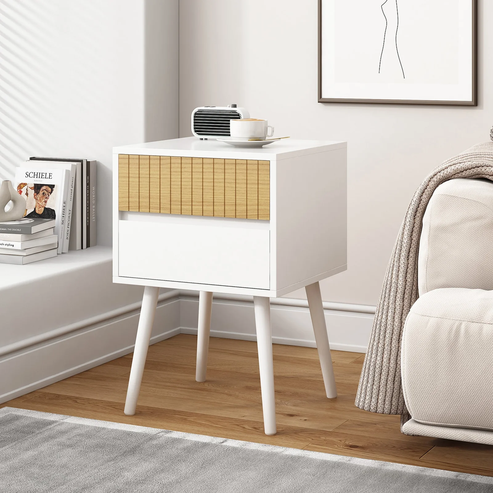 Materials: MDF painted body, Solid pine wood legs, MDF & melamine drawer front