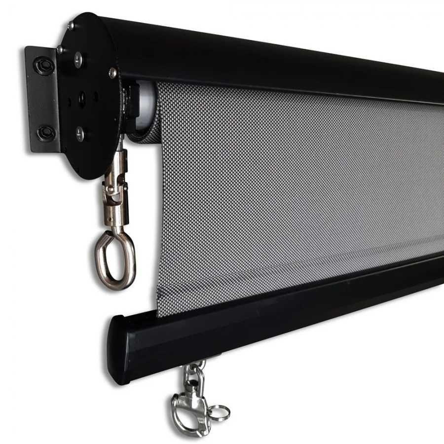 Gearbox system will keep a drop of the awning at any desired height. The bottom bar of the awning can be hooked using a stainless still buckle, and the fabric will be taught lightly by lightly tensioning it using a gearbox.