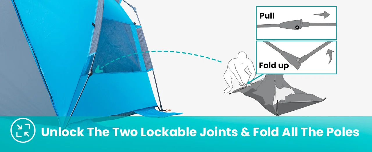 • Pop Up Beach Tent Instant Setup: no tools, no stress! 1 person can setup easily in seconds, fold the tent and push down the frame, the beach tent stand up instantly. Frustrated days of bulky tents and complicated instructions has gone!