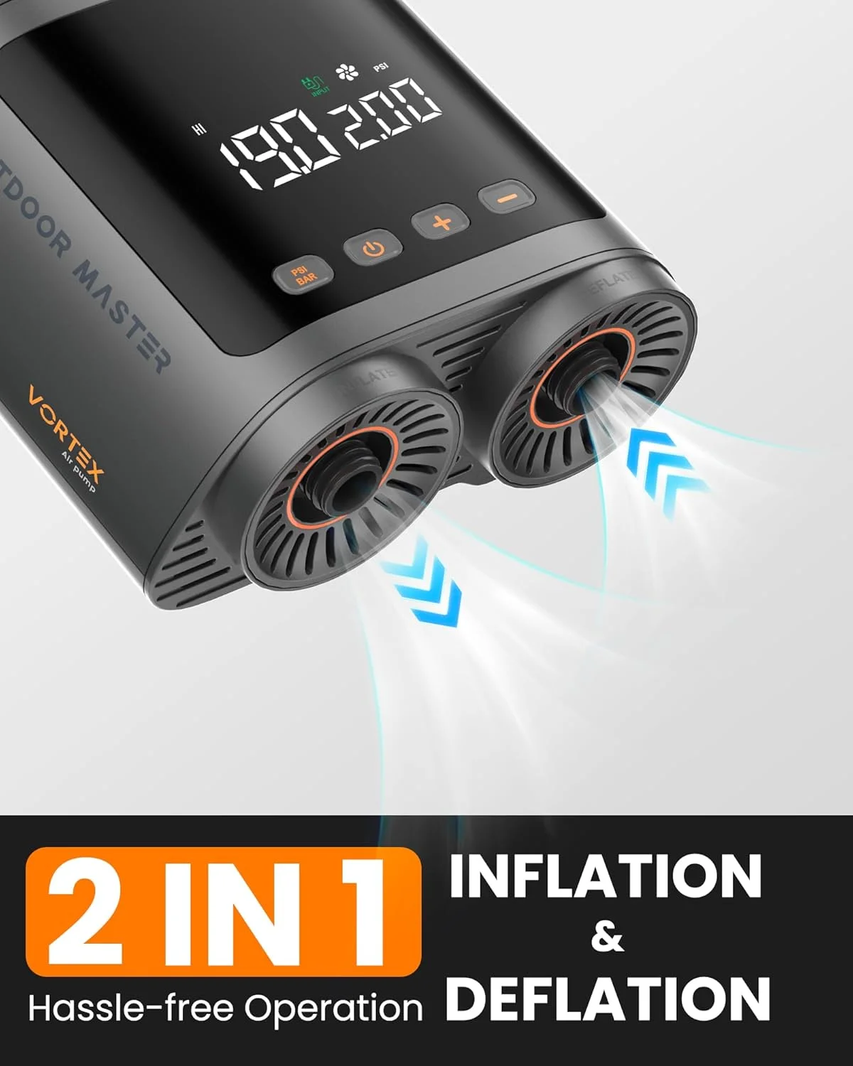 OutdoorMaster Vortex Pro 57.7Wh Rechargeable Paddle Board Pump Portable, Electric SUP Pump Battery for 3 SUPs Inflation & Deflation, Max 20PSI 12V/15.8V DC & Type-C Input, 8 Nozzles for Inflatables