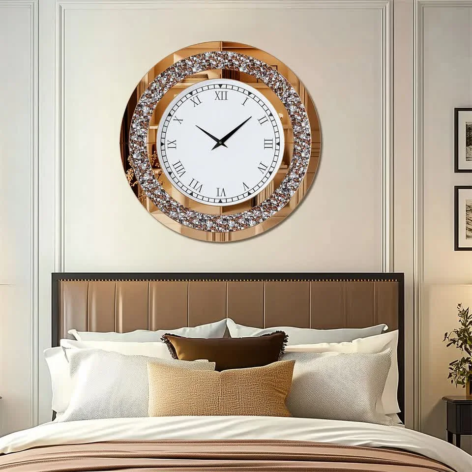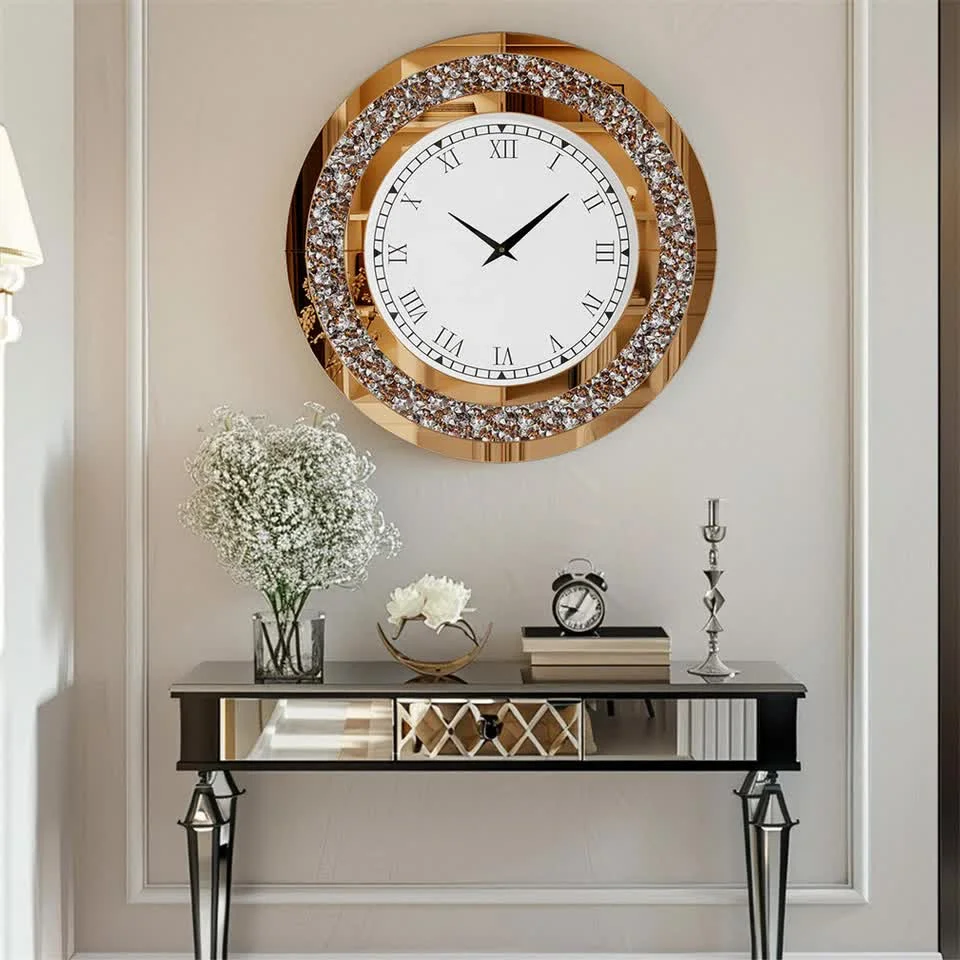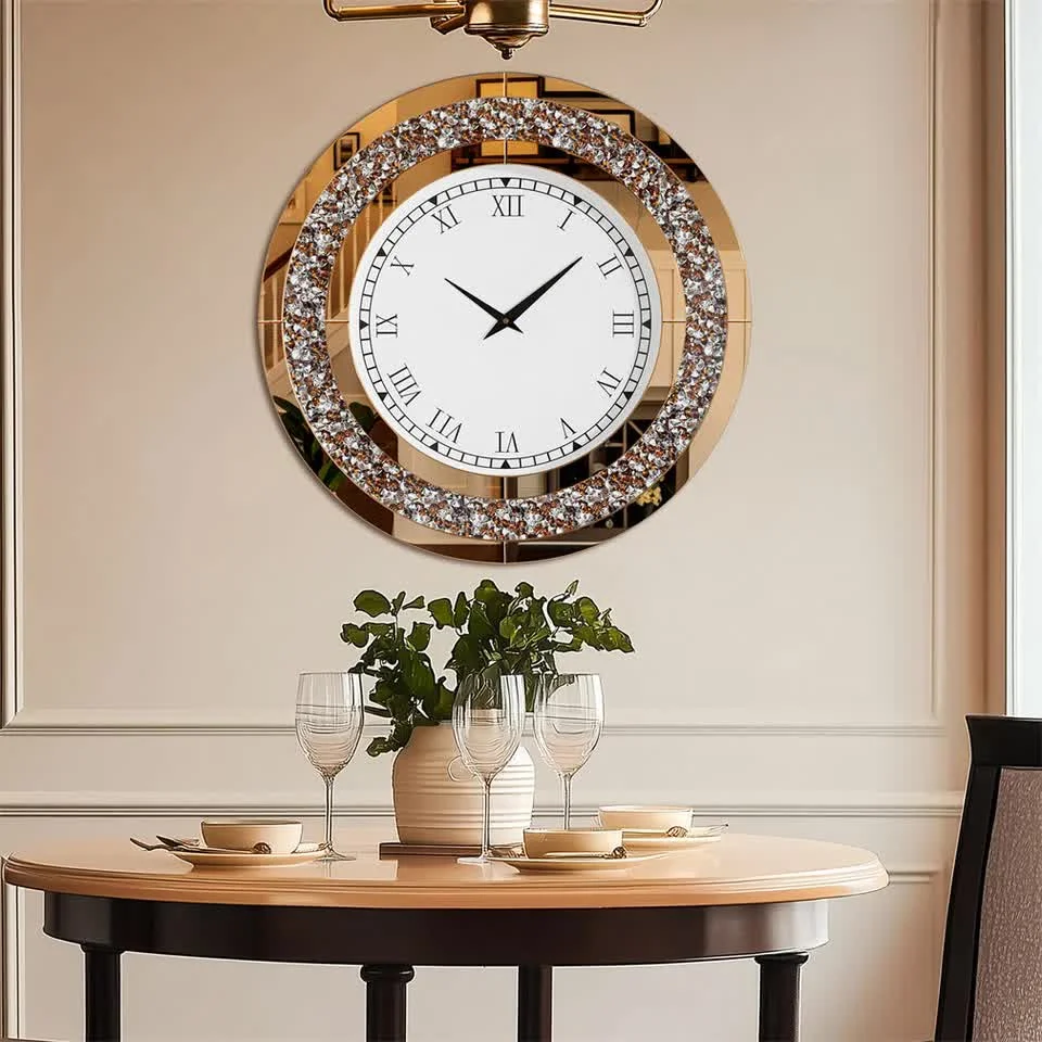 Luxurious Wall Clock:This wall clock features an exquisite inlay of sparkling tawny tinted crushed diamonds on its surface, surrounded by a sleek glass edge frame, giving it an embellished and sparkle look, the combination of these elements creates a stunning visual effect and distinctive appearance, sure to catch the eye of anyone who enters the room