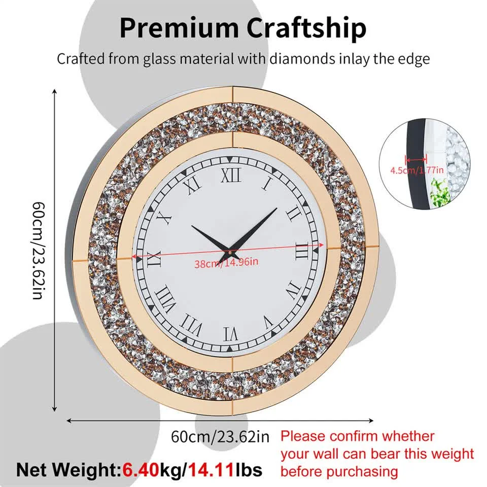 Unique Timepiece:Meticulous fusion of sparkle crushed diamonds and glass edge frame for a unique and timeless look, exuding an air of sophistication and opulence, enchanting bling bling effects, you can also mix and match different styles of mirrored artwork and furniture to create a more sophisticated and cohesive look