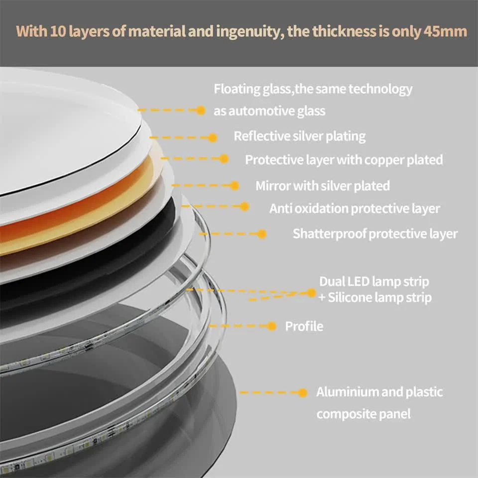 Premium Durable Structure bathroom mirror is made with 4mm thicken HD glass and wrapped in durable aluminum frame for high strength and stability, eco-friendly and safe. Finely polished and smooth finish for an elegant look, adds dimension in a room. UL certificated electric elements. IP44 waterproof rating ensures safe lighting in wet bathroom environments