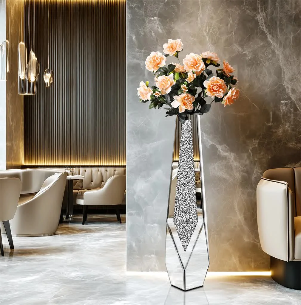【Crushed Floor Vase】Crafted from silver glass with solid MDF structure, the diamond vase remains anti-rust and durable for long service life, no need for assembly, it will be delivered to your home in the shape shown in the picture, gently wipe surface clean with a soft cloth to remove any dust or residue from transportation, ready for display, built-in foot pads on the vase bottom to prevent from scratches and slippage, pairing it with other mirrored furnishings to create a cohesive and stylish look, this stylish vase makes an excellent housewarming, birthday gift for someone who loves flowers
