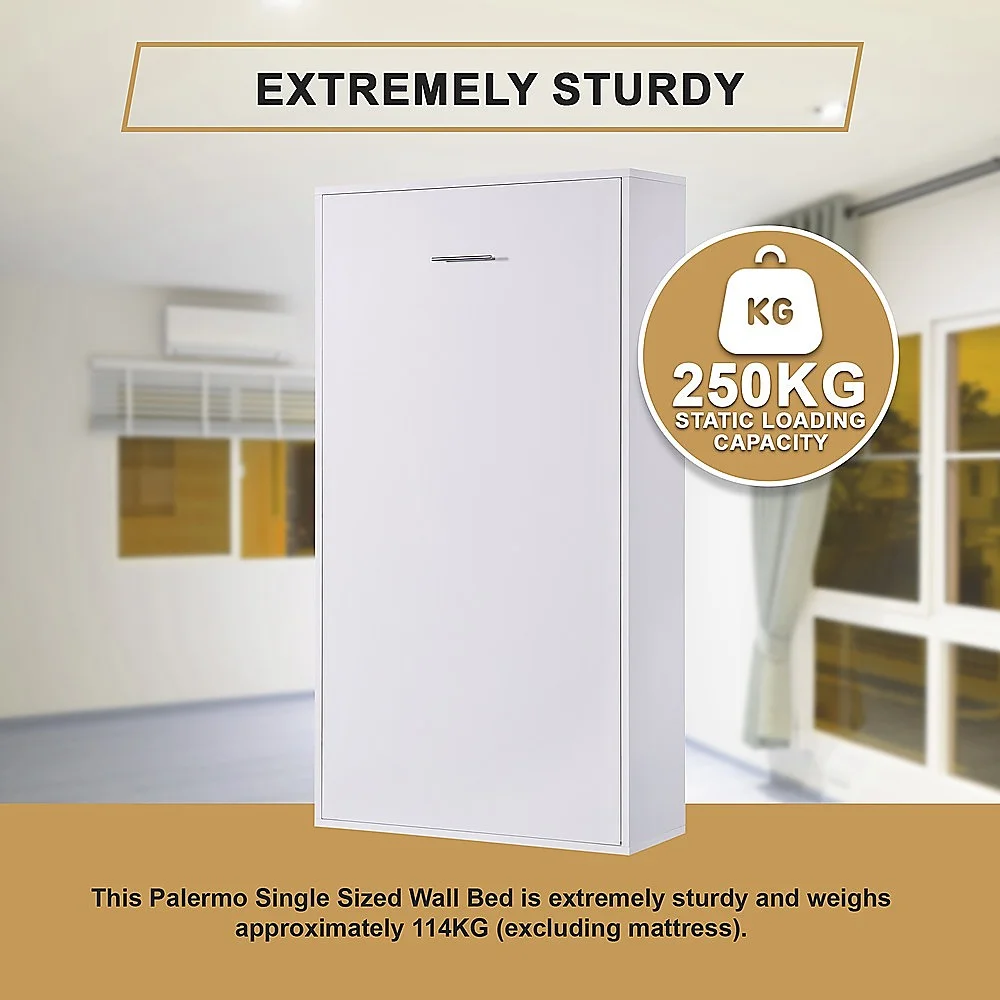 This Palermo Single Sized Wall Bed is extremely sturdy and weighs approximately 114KG (excluding mattress). Be sure to do your research to ensure you dont purchase a similar looking model (e.g. other online sellers having ones that weight approx 130kg including mattress) that doesnt live up to Palermo's quality.