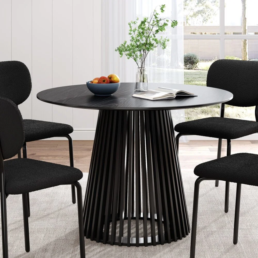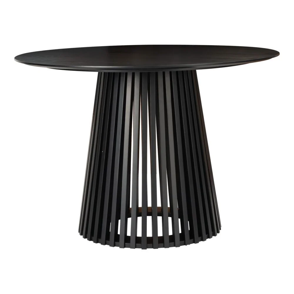 "Palmer Sleek Silhouette Dining Table" in black features a slatted design that redefines elegance in modern dining spaces. This table is crafted to elevate your dining experience. With its slatted conical pedestal solid wood base and a 20mm thick MDF tabletop, the Palmer Sleek Silhouette Dining Table combines durability with design finesse.
