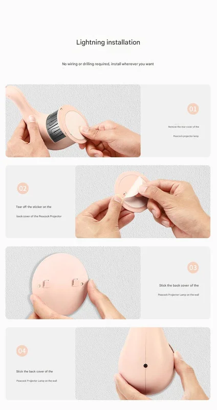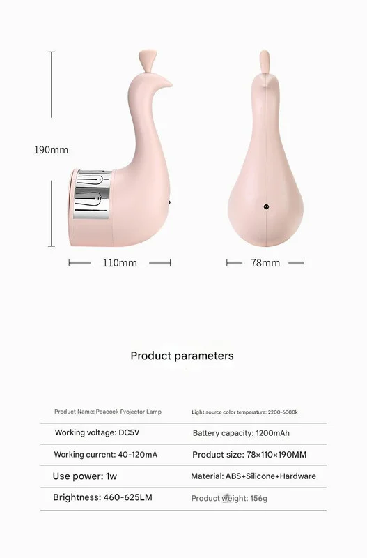 Create a magical ambiance in any room with our Peacock Projection LED Night Light. This beautifully designed lamp, shaped like an elegant peacock, projects a stunning, colorful light pattern reminiscent of a peacock's tail feathers onto your wall or ceiling. It's a perfect decorative piece that doubles as a soothing night light for bedrooms, living rooms, nurseries, or any space needing a touch of warmth and romance. Featuring both remote and touch controls, you can easily switch between multiple colors, adjust brightness, and set timers. The low-power, USB rechargeable design makes it an eco-friendly and convenient lighting solution. With a quick, drill-free 3-second installation using the included adhesive backing, you can place it anywhere you desire.