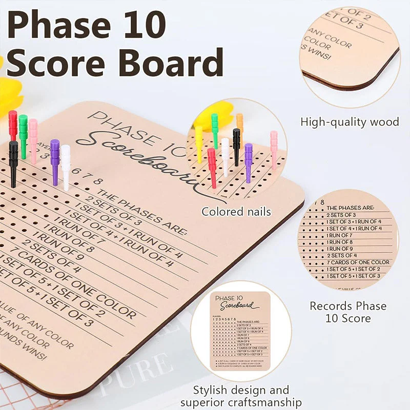This wooden scoreboard elevates Phase 10 game nights.Crafted from durable wood, it tracks up to 8 players’ progress across 10 rounds.Laser - etched phase instructions and colourful pegs keep gameplay organized and fun.Sturdy enough for indoor/outdoor use, it’s a stylish, reusable upgrade from paper scorecards.
