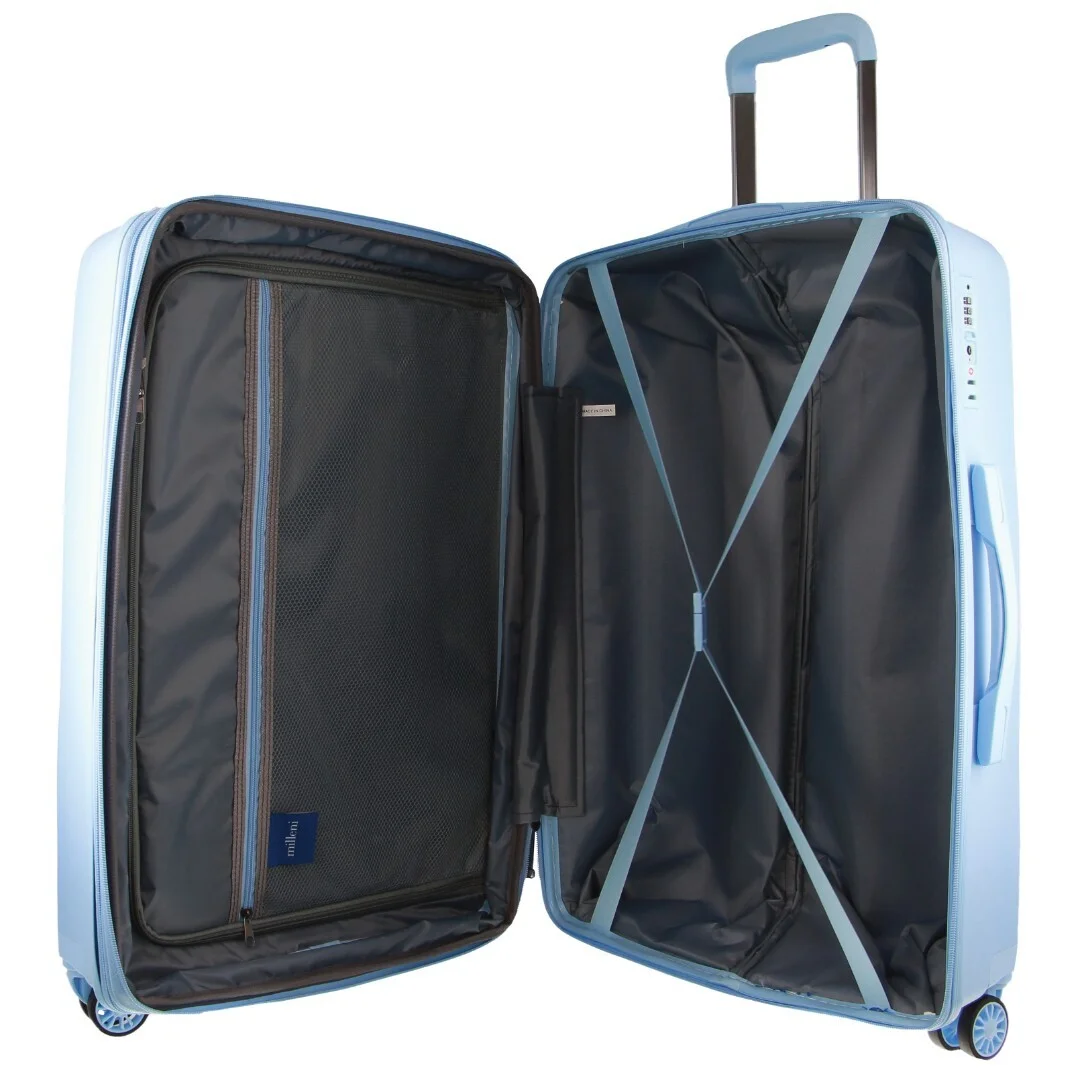 Embark on your next adventure with the Milleni Hard Shell Luggage Bag, inspired by the iconic Pierre Cardin. This 65cm checked luggage in a stunning blue hue is the epitome of style meets functionality, tailored for the contemporary traveler who values both aesthetics and practicality.
