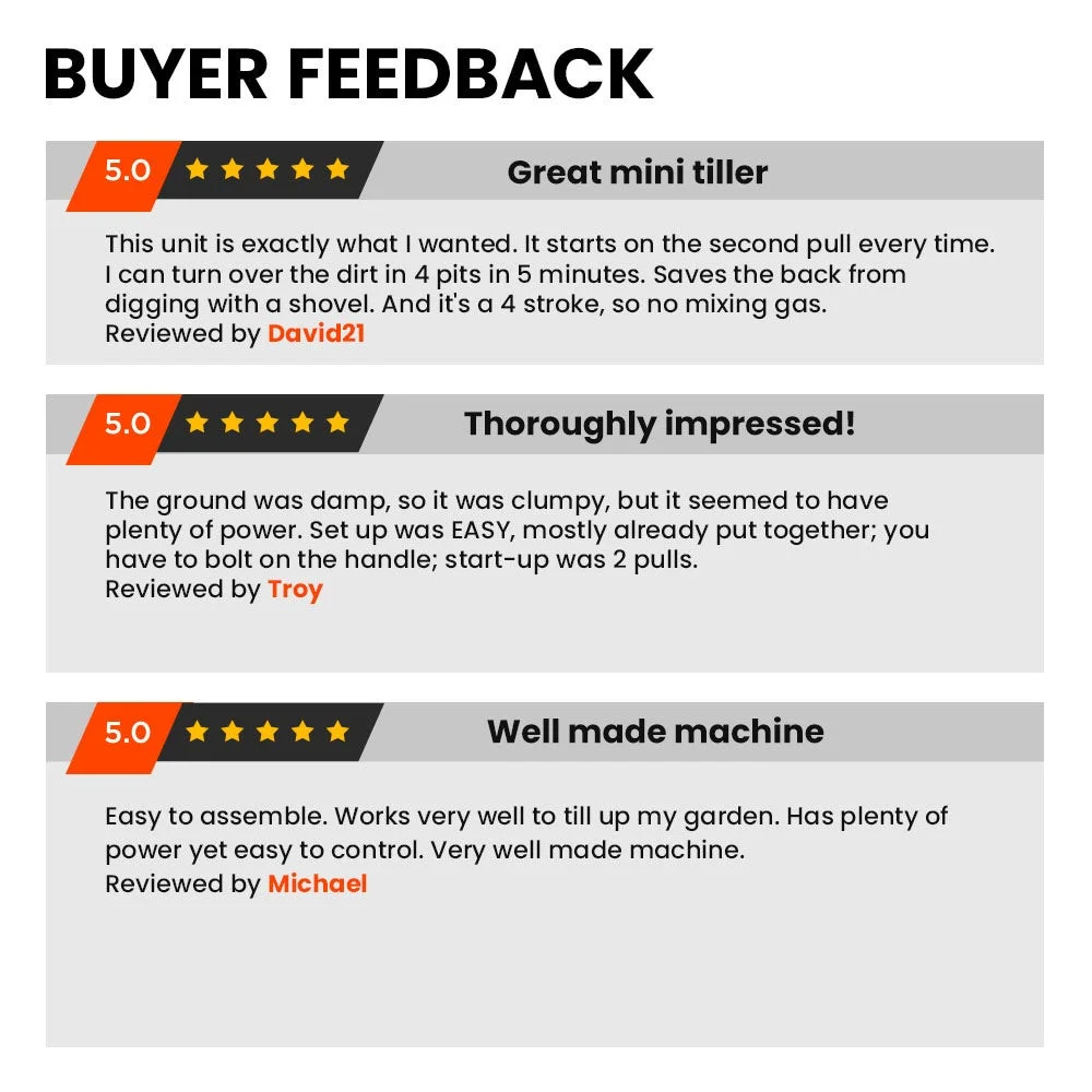 The premium 46cc OHV powerful easy-start 4-stroke engine is powerful enough to turn up dry compacted soil along with the benefits of quieter operation, less vibration, less smoke and no fuel mixing hassles!