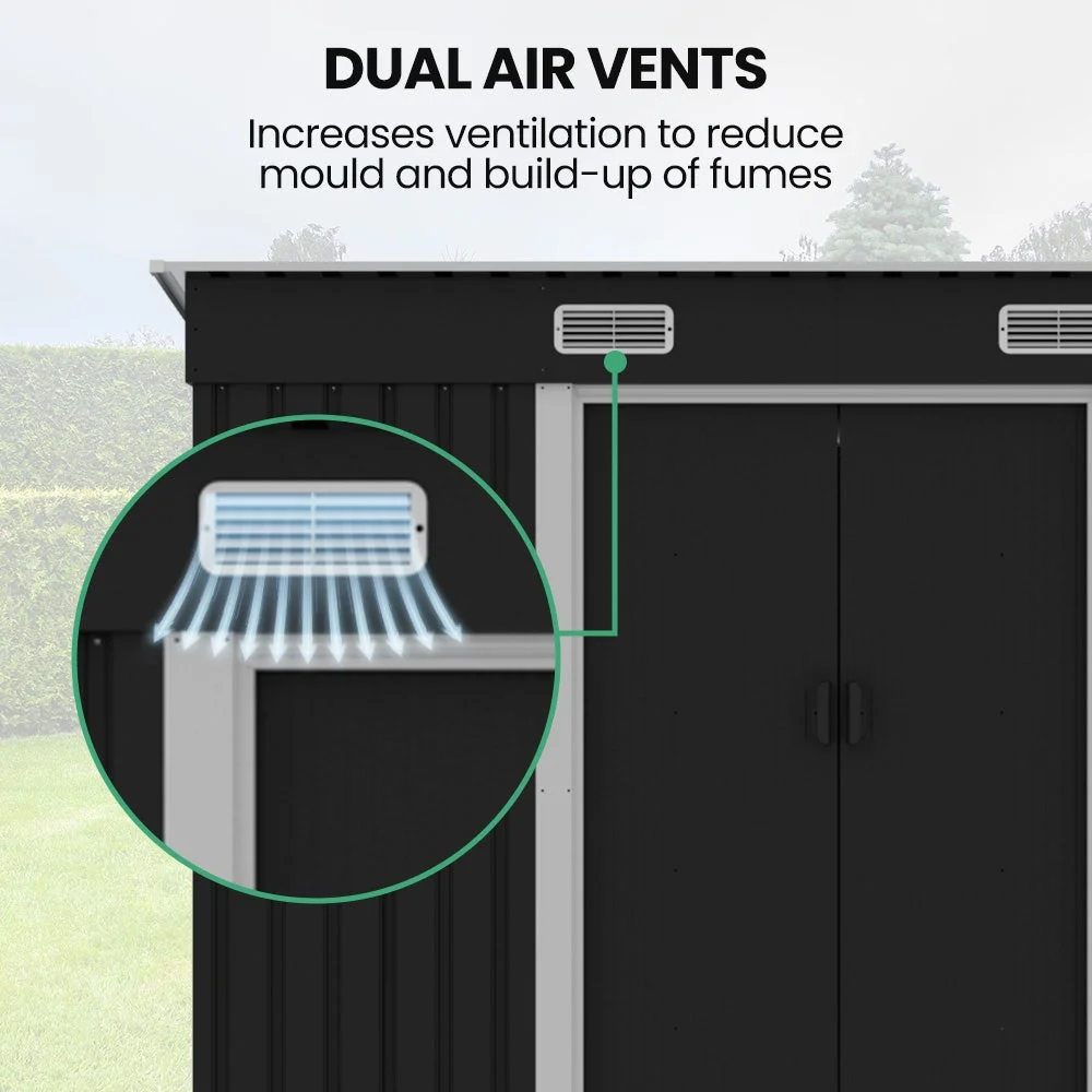 Dual air vents ensure the interior is well-ventilated, helping to reduce mould and any build-up of fumes. Smooth sliding doors offer wide, easy access, comfortably accommodating large items. The bonus floor frame (RRP $119.90) adds structural strength and can also support optional flooring on top of it.