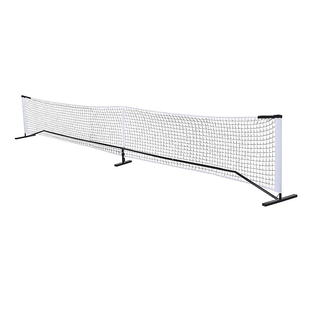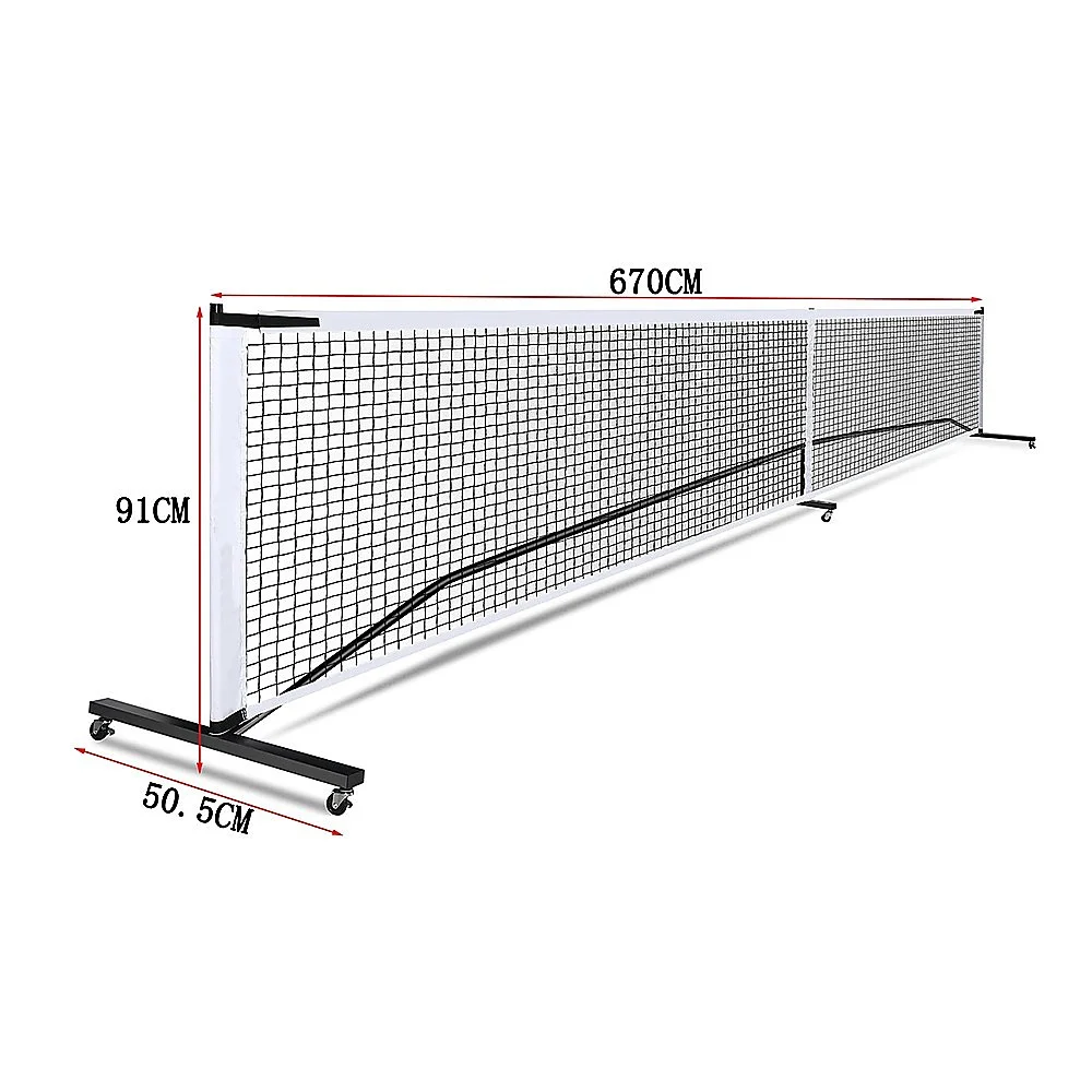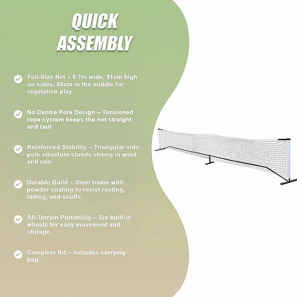 Take your pickleball game anywhere with this premium 6.7m portable net set. It features a tensioned rope system that keeps the net taut and straight, minimising sagging in the middle, even without an intermediate pole. The adjustable straps provide additional reinforcement, ensuring consistent net tension during play.