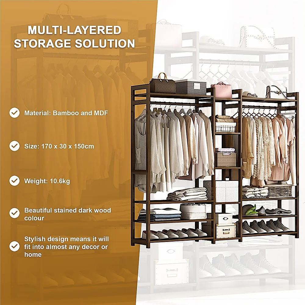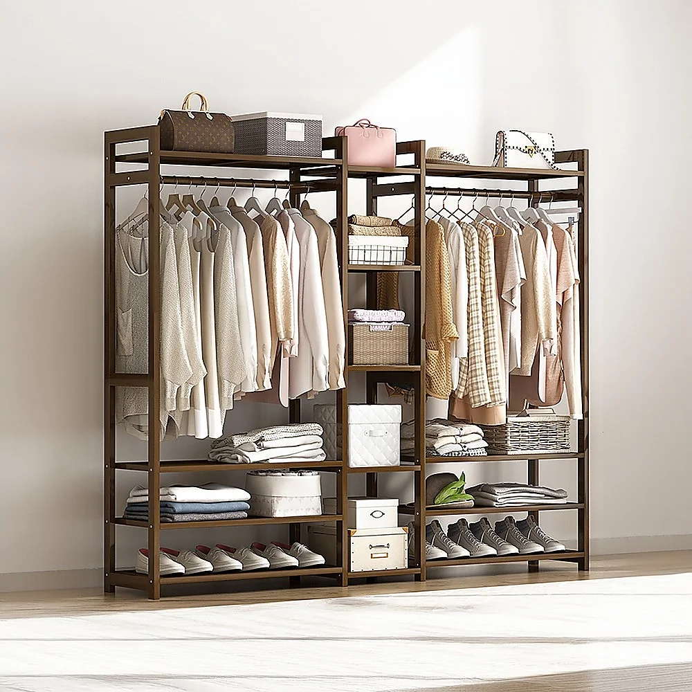The Randy and Travis Machinery Portable Clothes Rack may be an ideal answer. With enough hanger space to store your clothing and full-height drawers built into the side, you will have plenty of storage space at your fingertips. The added storage racks at the bottom are perfect for shoes, boxes and other miscellaneous items. Finally, there is an additional shelf at the top of the clothing rack which is beneficial for storing your linens, spare blankets and other bulky items. This bamboo rack comes in a beautiful stained dark wood colour that will look fantastic in any environment.