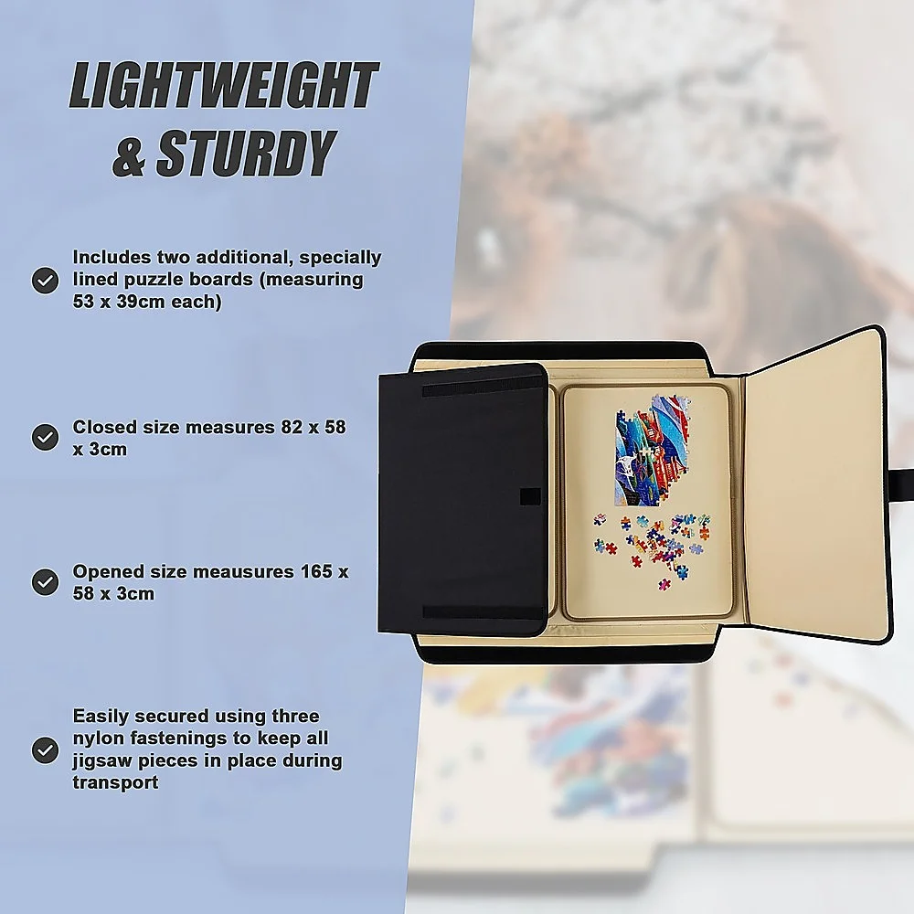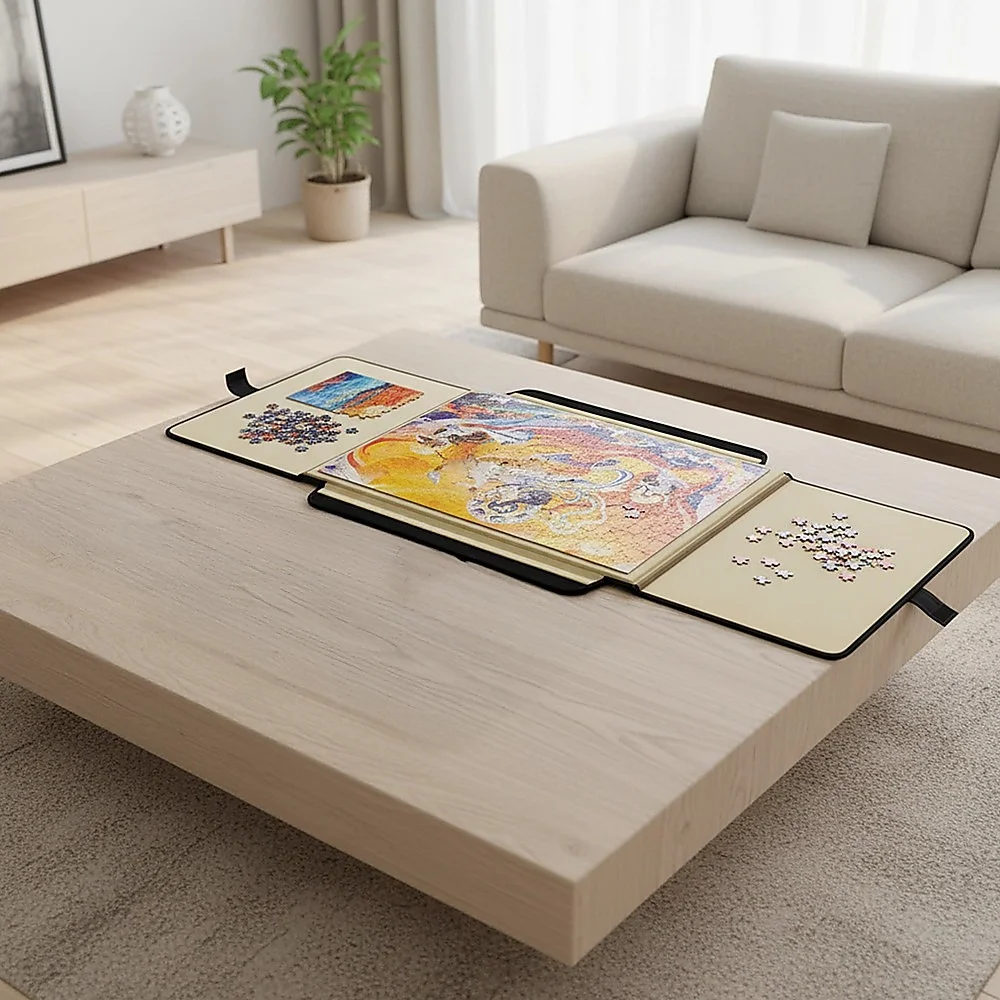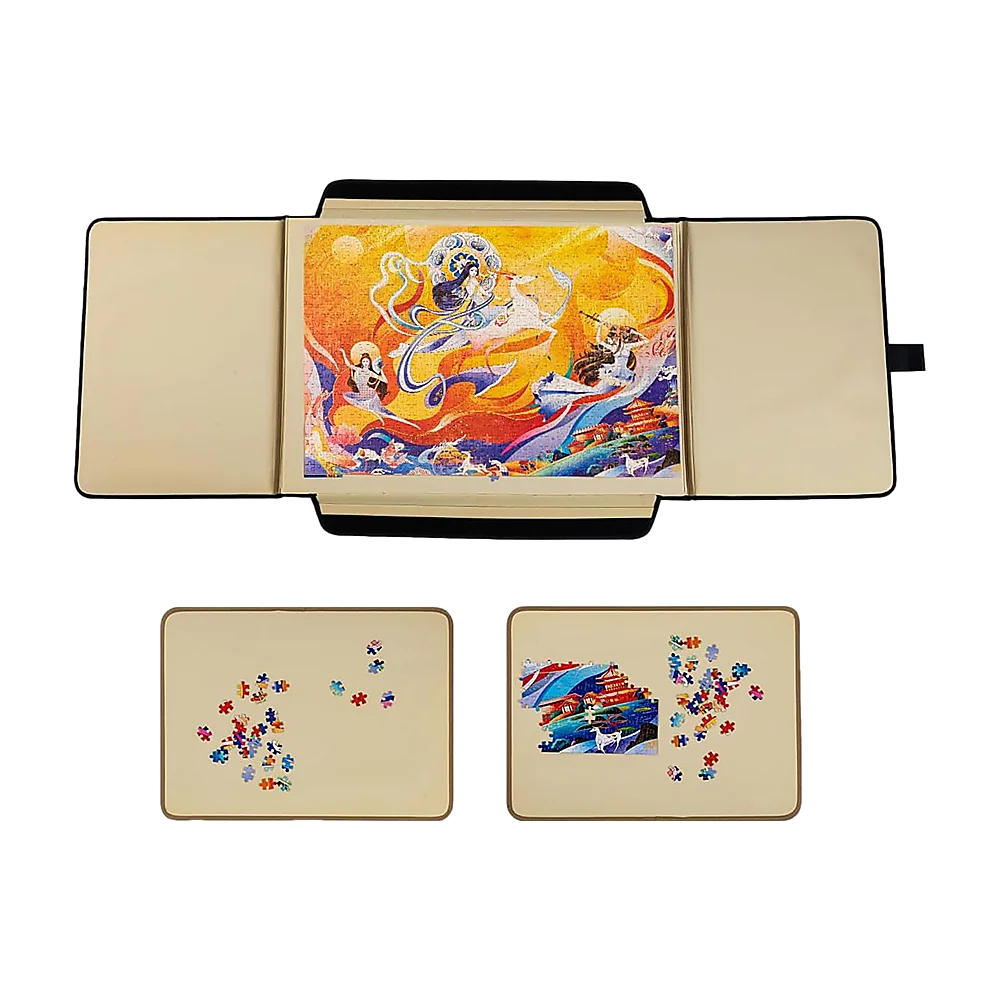 Introducing the Portable Puzzle Mat, a durable puzzle board with inserts that securely store all your jigsaw pieces when closed. Featuring a specially designed lining, it not only keeps puzzle pieces in place but also provides an ideal surface for assembling puzzles.