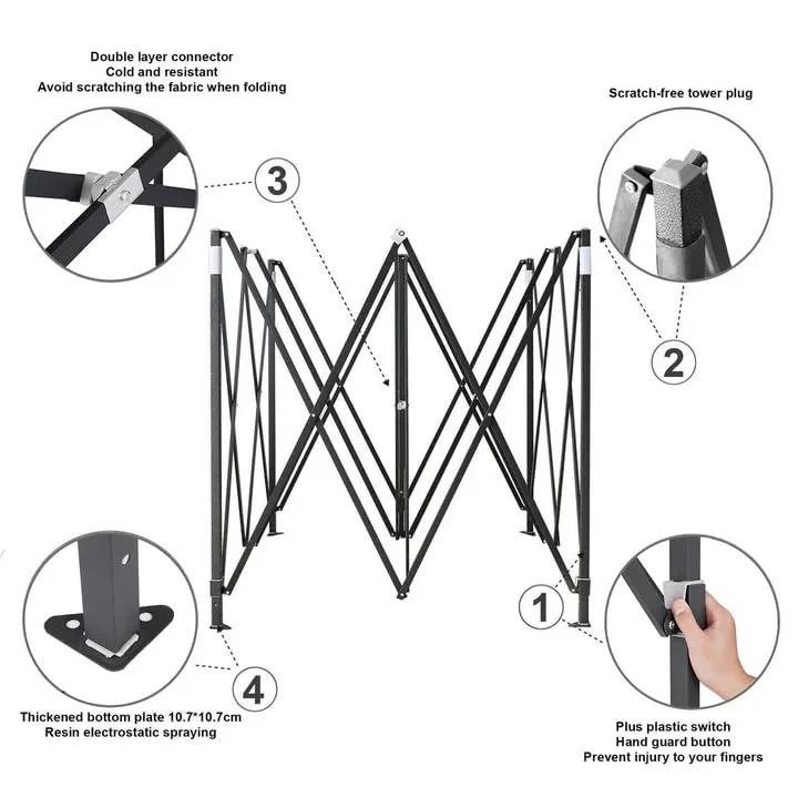 • Widely Usage in Various Places: Due to its portable design, our 2x2m canopy is convenient and ideal for both personal and commercial use,party, camping trips, BBQ or other activities in your own garden on backyard.