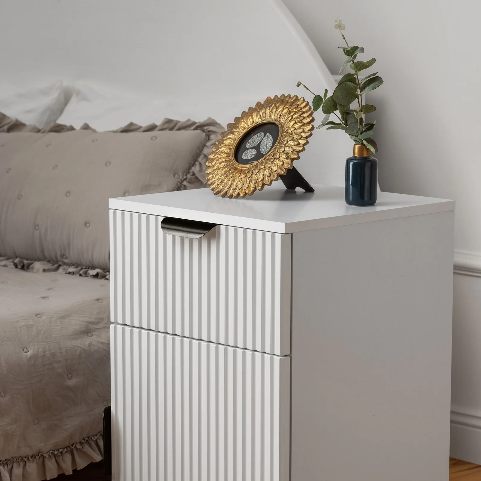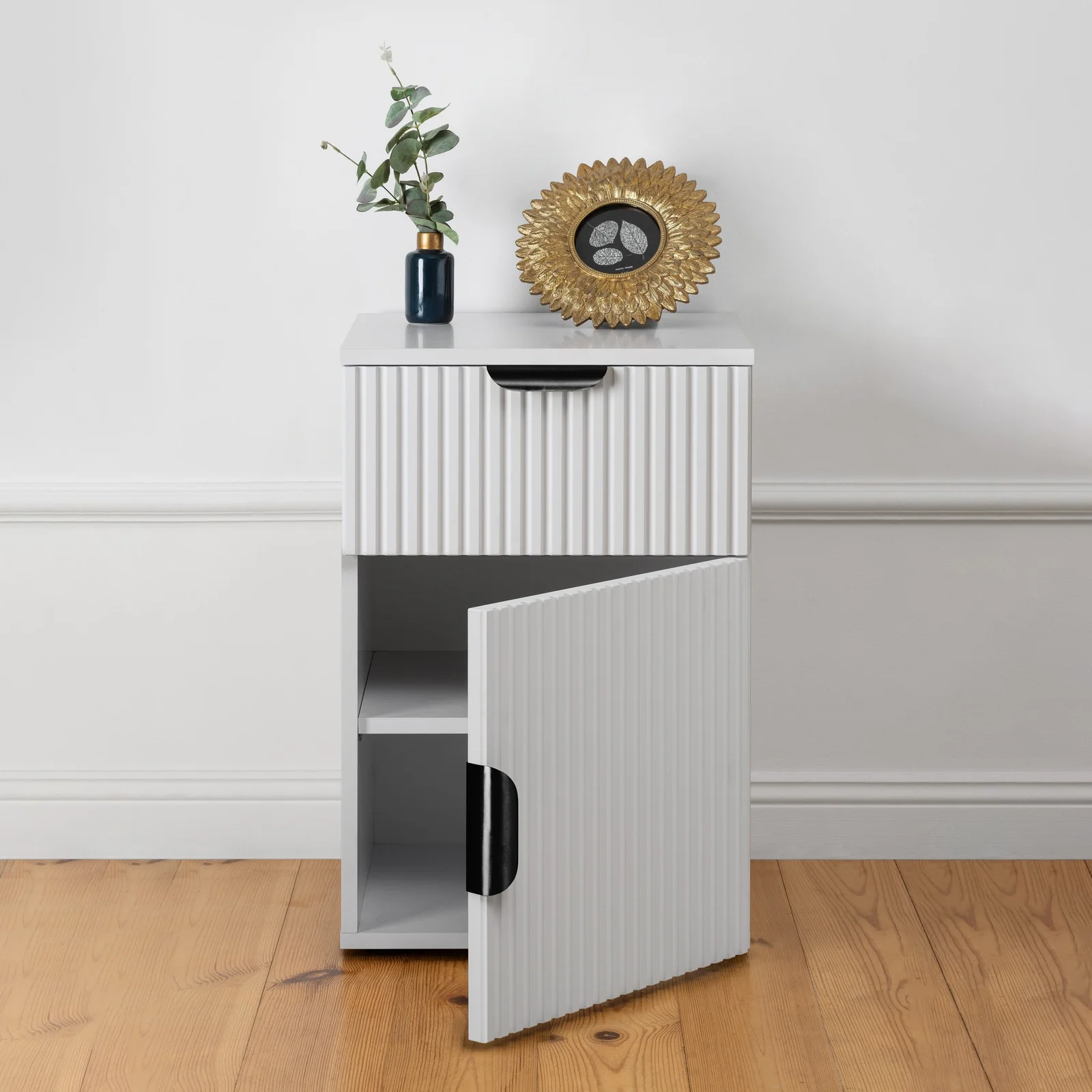 PORTO BEDSIDE TABLE - WHITE - VJ PANEL - ROUND BLACK