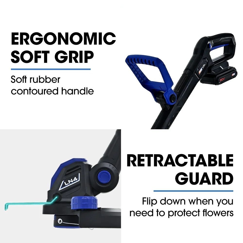 The LN4 Line Trimmer/Edger combines versatility and precision, featuring a 5-angle swivel head for seamless transitions between trimming and edging. A convenient guide wheel ensures clean, precise edges every time, while the adjustable angle grip handle and quick-adjust shaft deliver maximum control and ease of use.