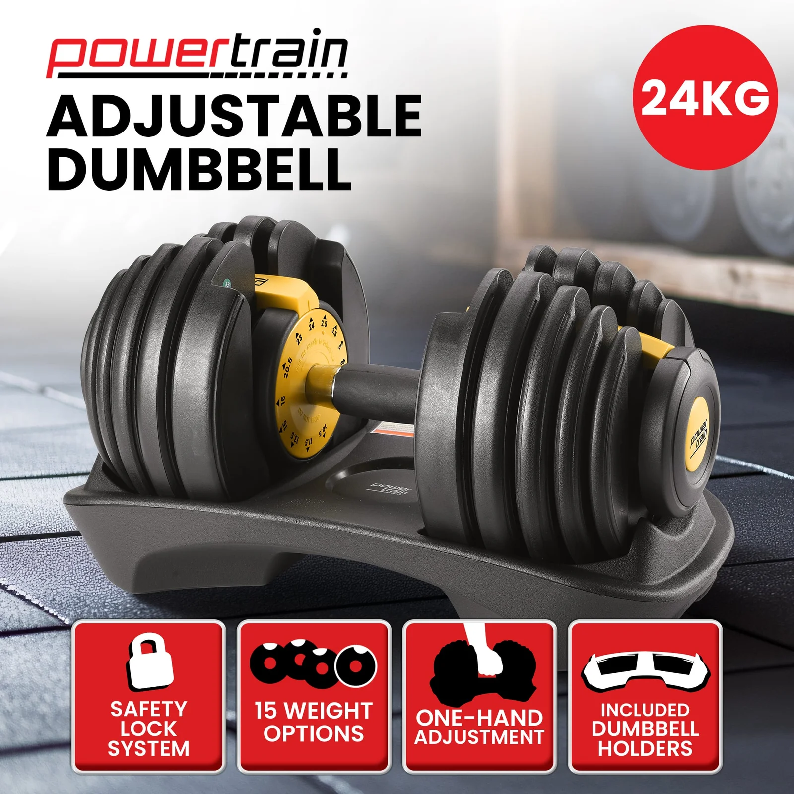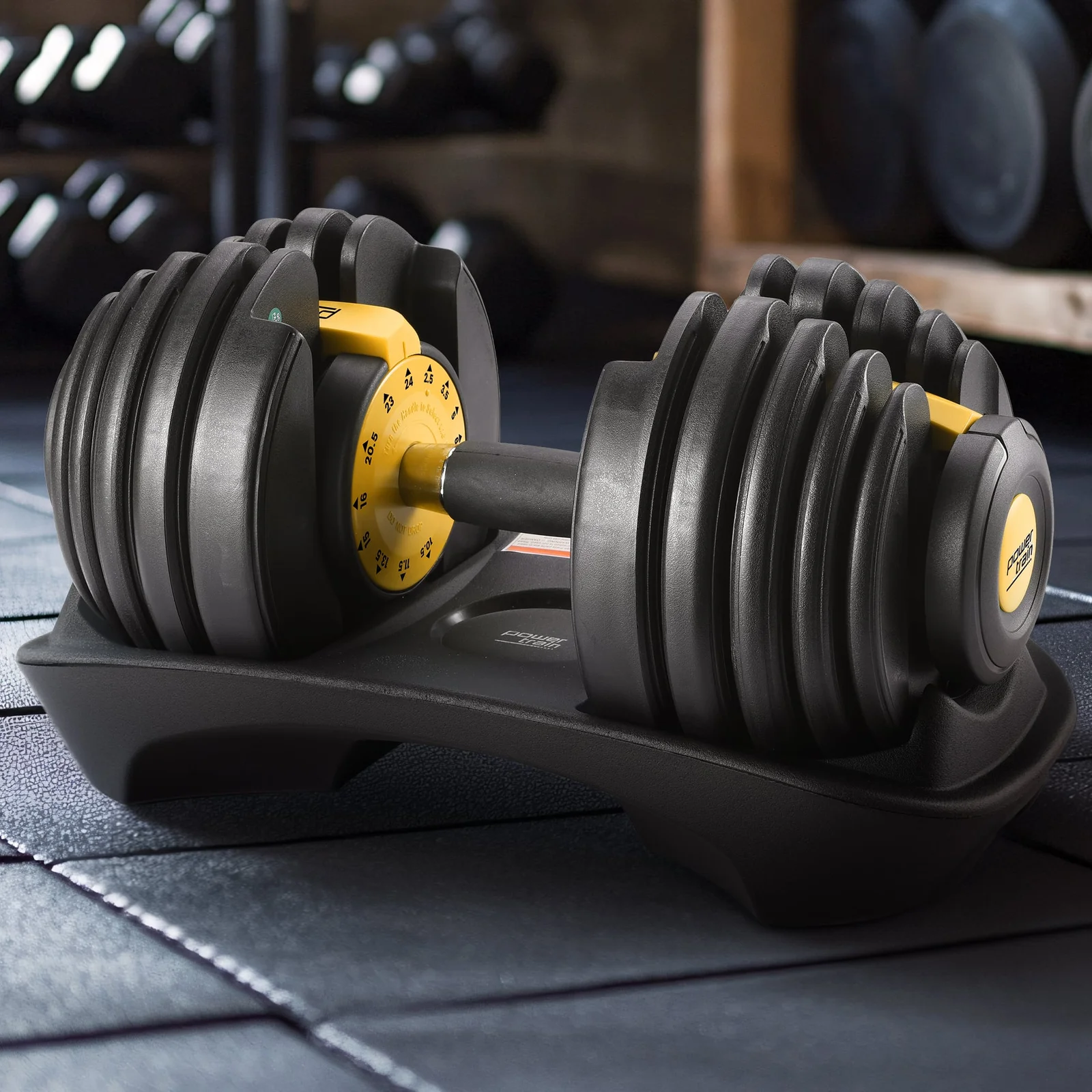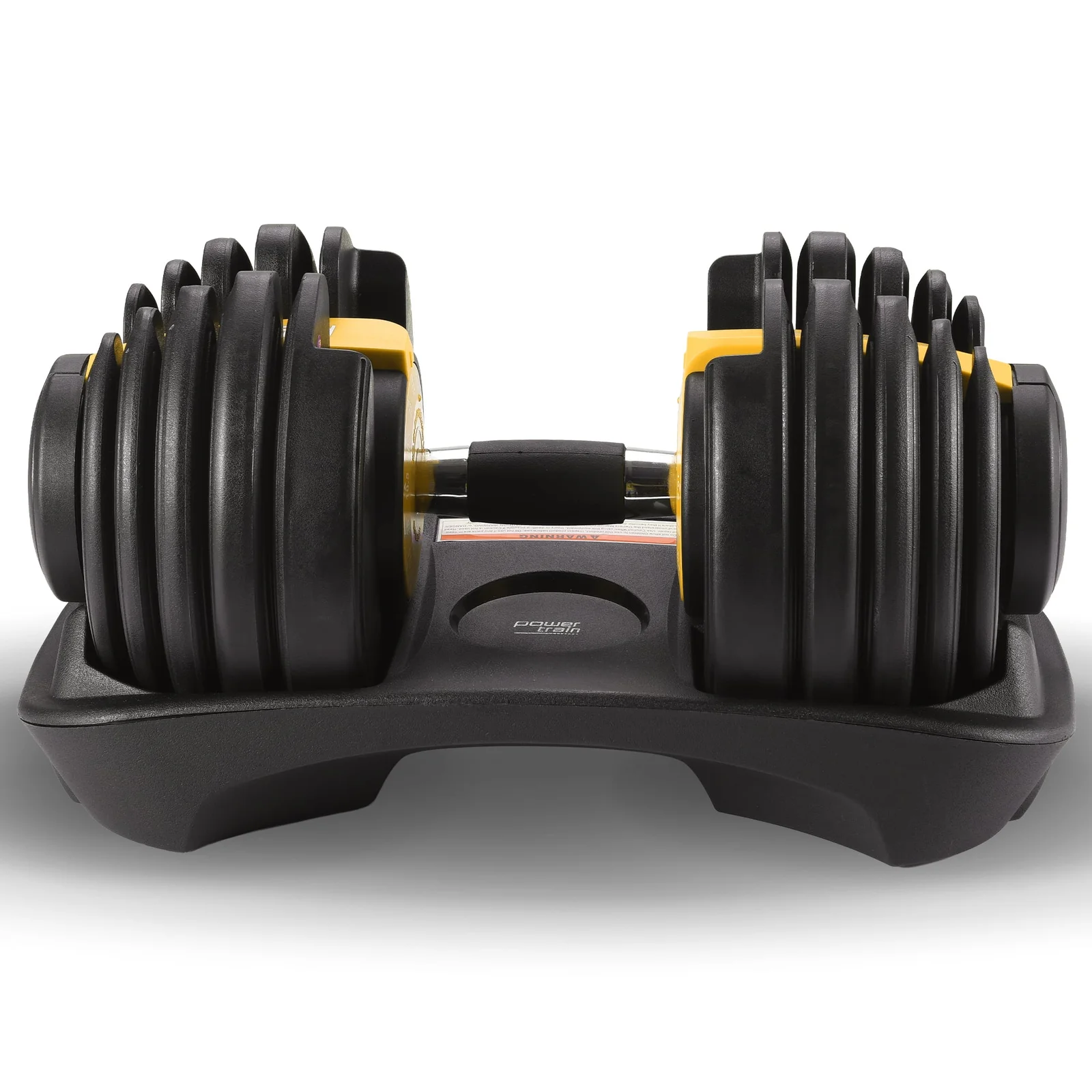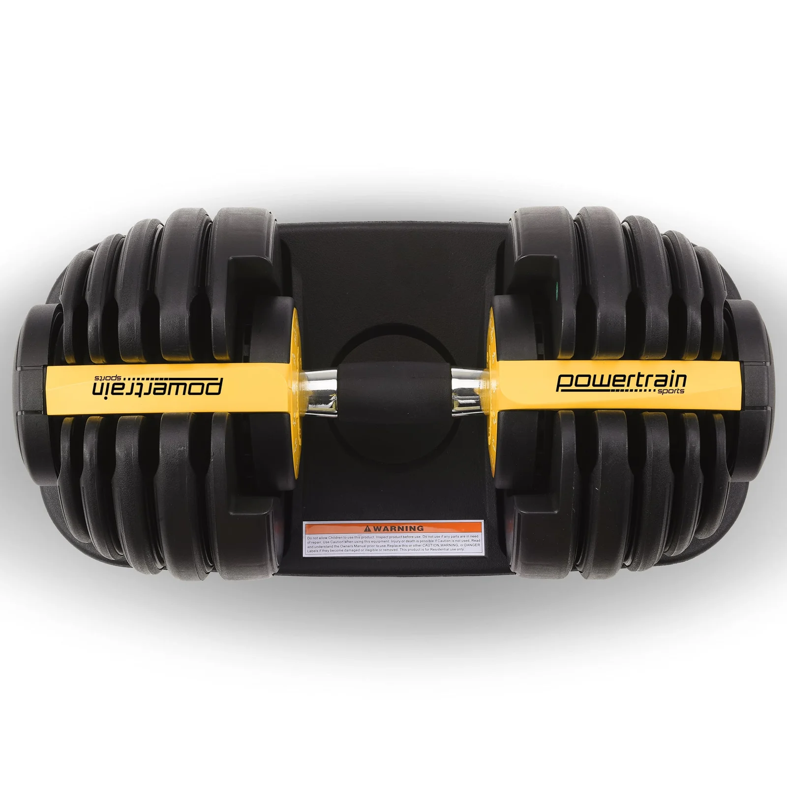 The PowerTrain Adjustable Dumbbell's ergonomic design makes it the most space-efficient and flexible strength-training option available. With just the turn of a dial, you can automatically change your resistance on this dumbbell from 5 pounds all the way up to 52.5 pounds.