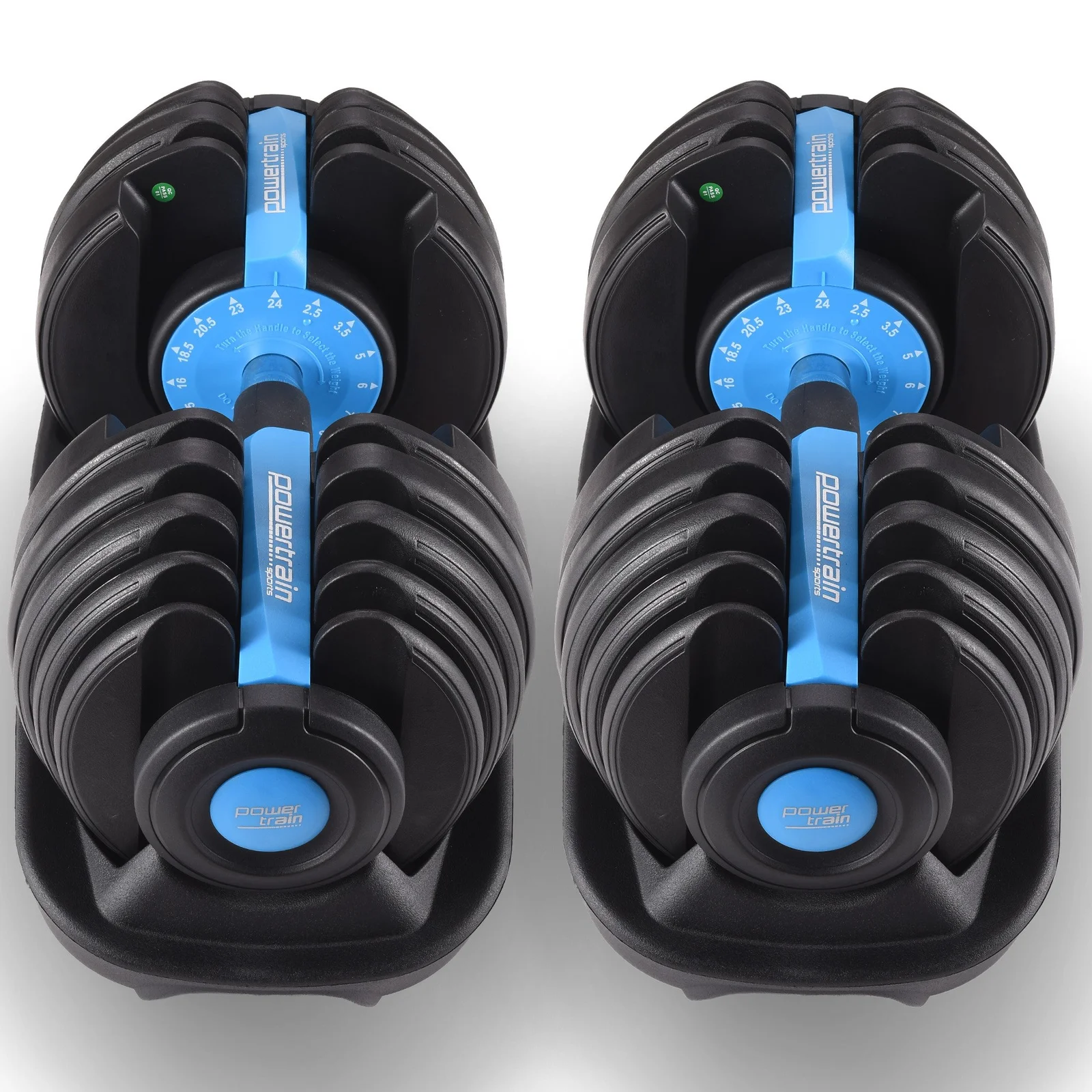 The PowerTrain Adjustable Dumbbell set's ergonomic design makes it the most space-efficient and flexible strength-training option available. With just the turn of a dial, you can automatically change your resistance on each dumbbell from 5 pounds all the way up to 52.5 pounds each.