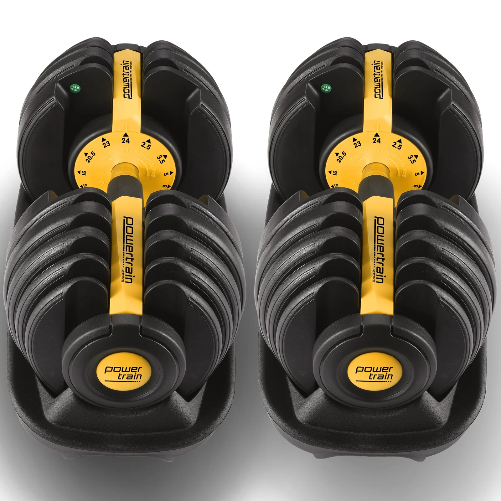 The PowerTrain Adjustable Dumbbell set's ergonomic design makes it the most space-efficient and flexible strength-training option available. With just the turn of a dial, you can automatically change your resistance on each dumbbell from 5 pounds all the way up to 52.5 pounds each.