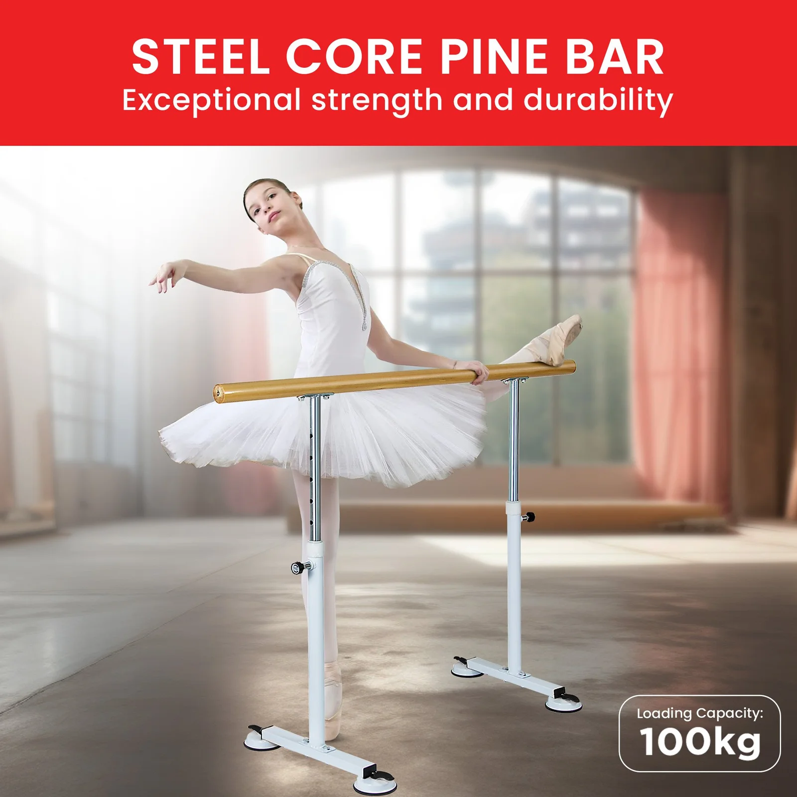 Upgrade your ballet practice at home with this versatile ballet barre from Powertrain. Made from a sturdy and durable pine pole and steel legs, it offers longevity and dependable support. The suction cups perfectly lock in place and provide excellent stability during use. Moreover, its adjustable height accommodates users of all ages and skill levels. Perfect for home, studio or on-the-go workouts, this ballet barre is a must-have for dancers and fitness enthusiasts alike.