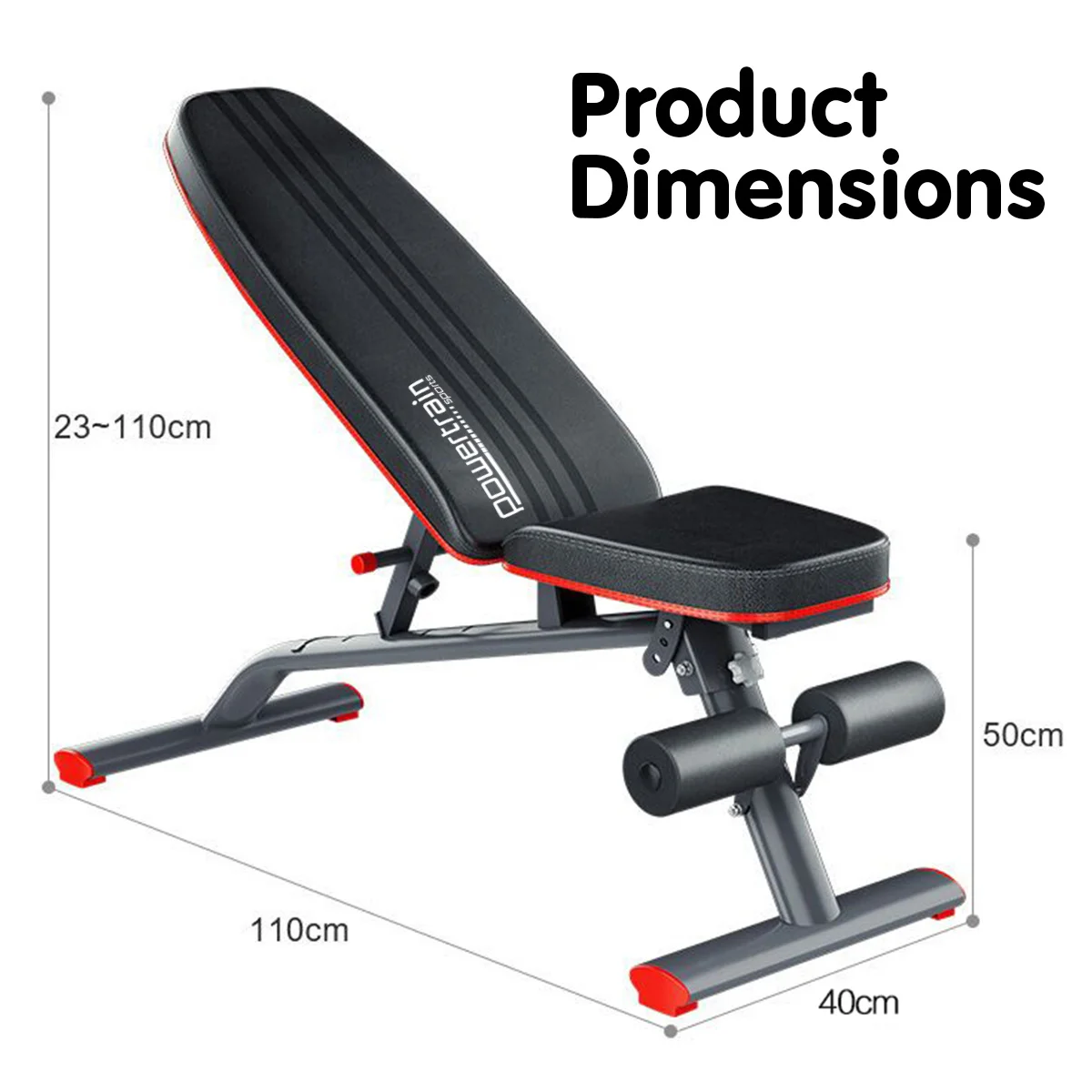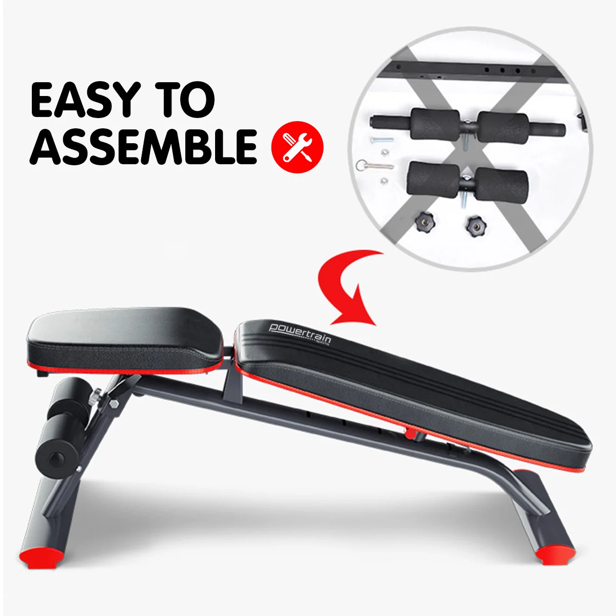 The PowerTrain adjustable bench is just what you need to sit and do dumbbell arm curls and leg extensions, as well as being an incline-flat-decline bench press with a total load rating of 250kg.