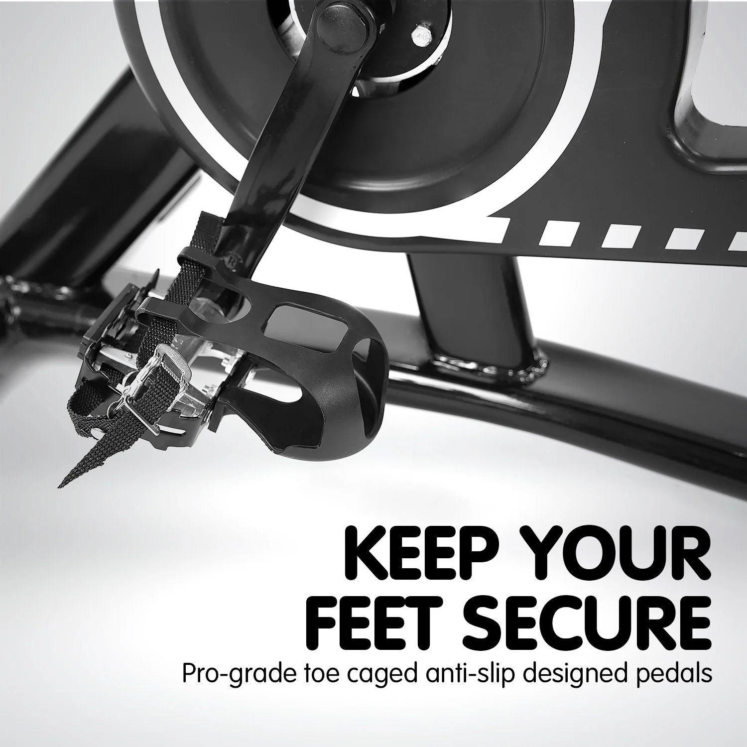 - Large pedals with toe cage design