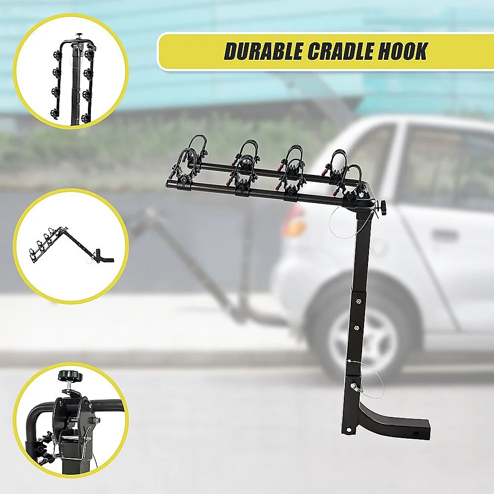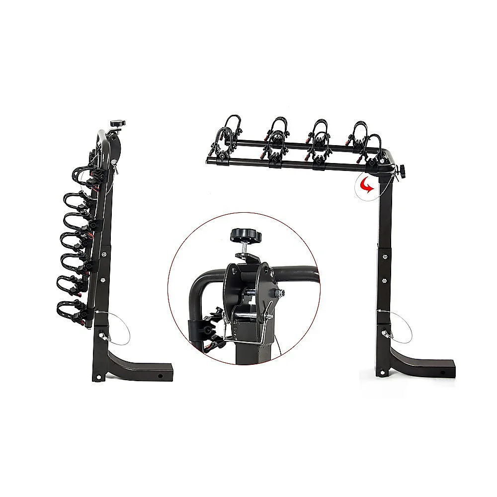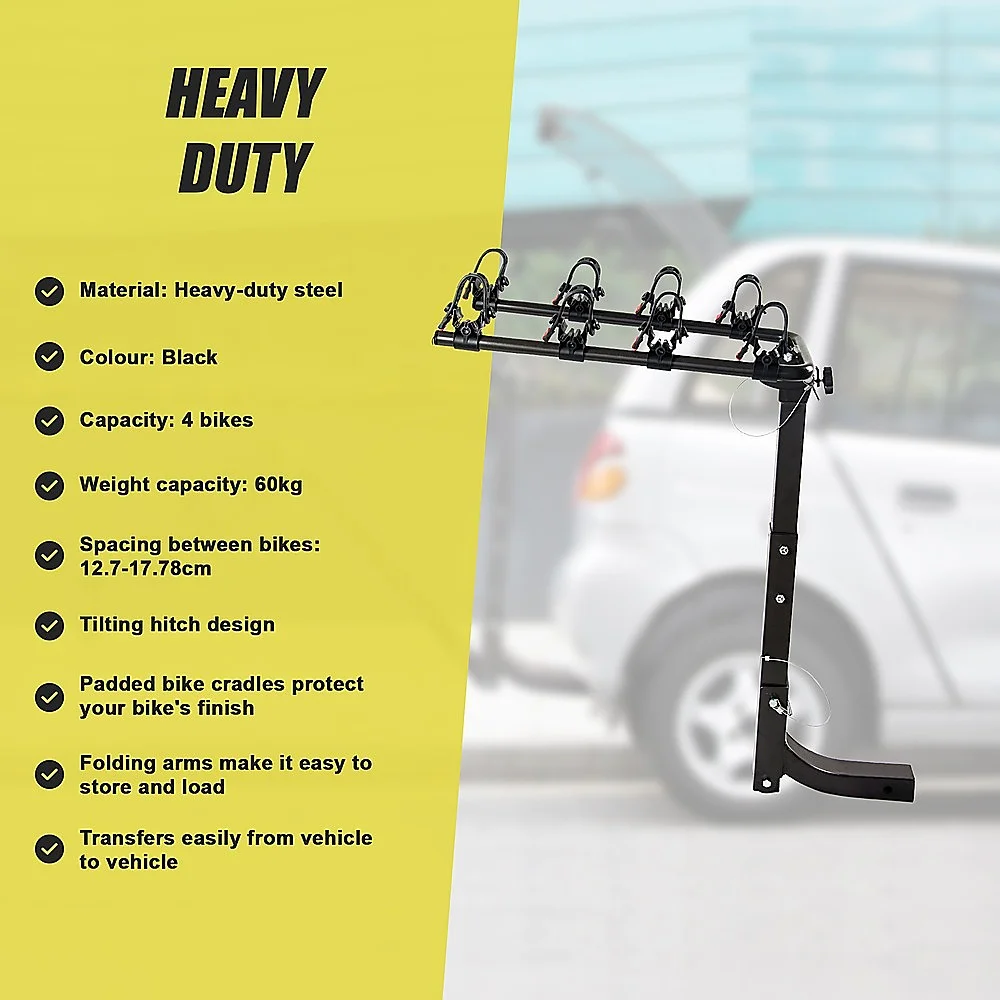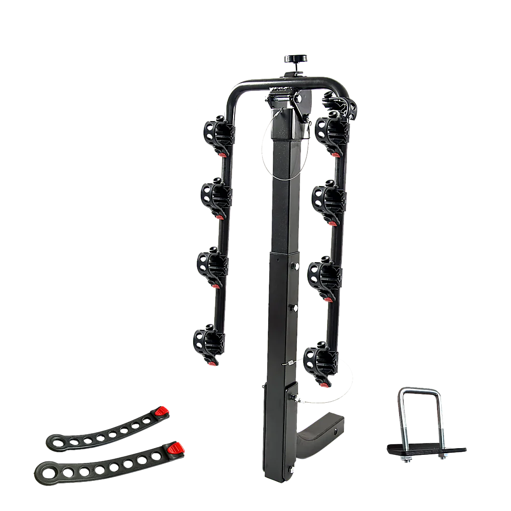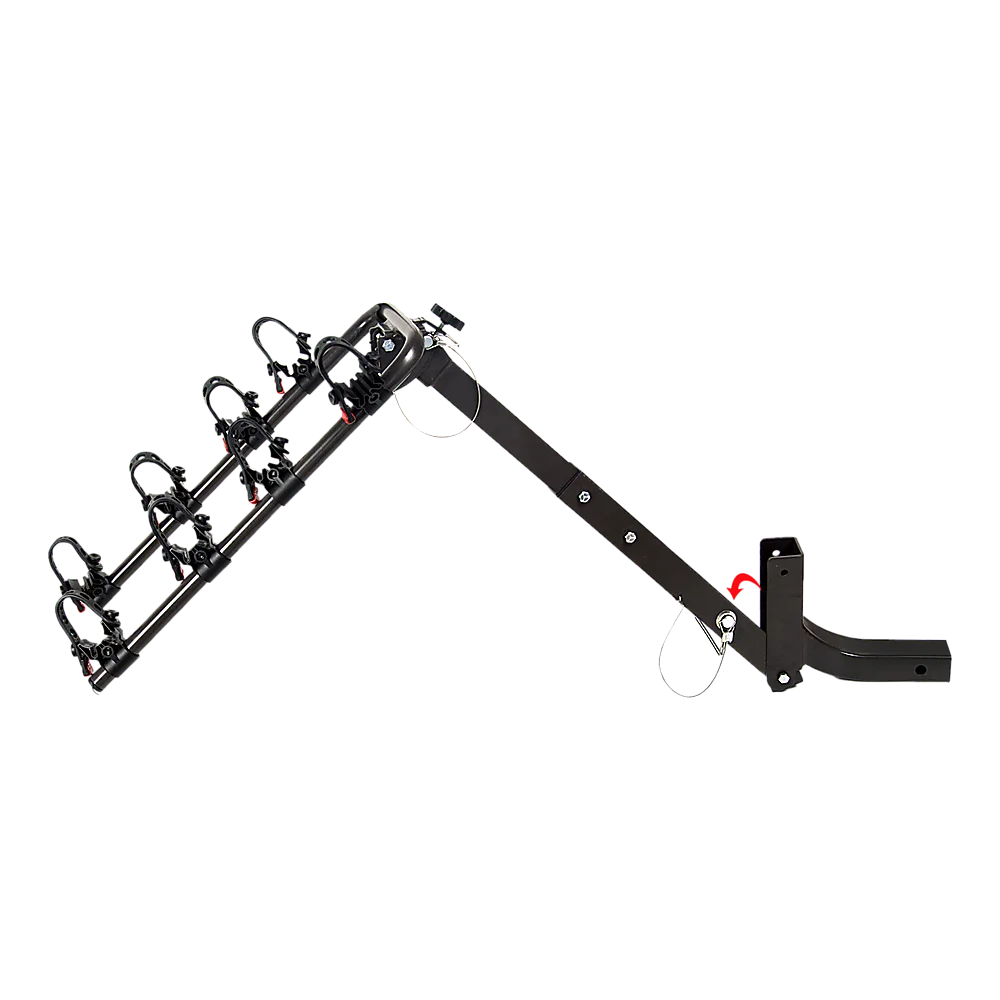 Done in neutral black in a convenient hitch rack design, this rack accents any vehicle's colour scheme. Folding arms make it easy to store after each use. Then, when you're ready to take off again on your next adventure, simply swing the arms up to load your bikes. Even better, the rack tilts down to give you easy access to your vehicle's boot. It's easy to install and even transfer from vehicle to vehicle. Get ready for your next holiday early. Order your four-bike rack today!