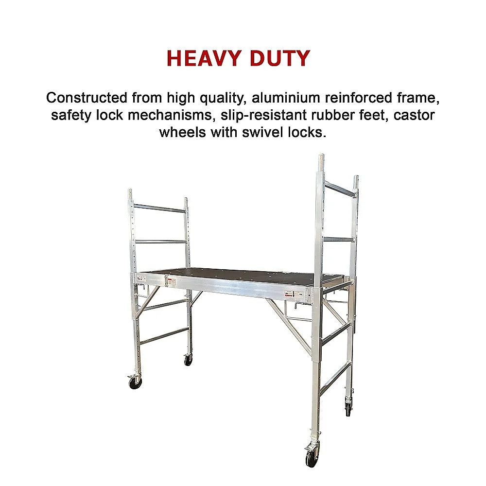 This aluminum one-level scaffold is sturdy yet its relative light weight makes it easy to move about. The maximum standing height is a generous 1.8m and the reinforced frame is HEAVY DUTY. The scaffolds strong aluminum construction and its safety lock mechanisms are two ways in which this product adds the optimum degree of safety to those must-do chores.