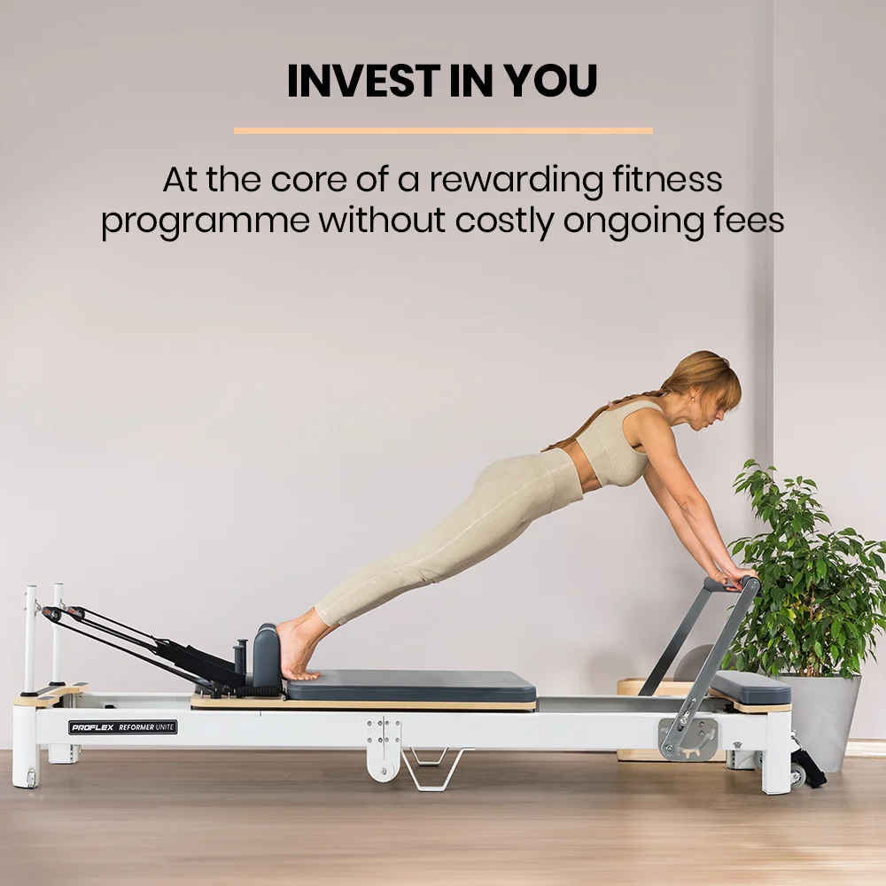 The Proflex Reformer Unite is meticulously crafted for home enthusiasts, from beginners to experienced users. This reformer merges elegance with functionality and durability, all within a convenient, folding design, continuing the 100 year history of Pilates using a reformer.