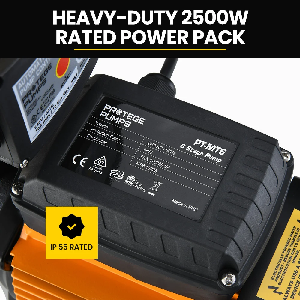 The PT-MT6 is perfect for a wide range of uses, from commercial greywater systems to agricultural irrigation and even emergency water supply. The pump's water temperature rating of 60℃ means it can handle even the hottest water. The PT-MT6 can handle any water-related task you throw at it. The pump with the included auto-controller has a maximum flow rate of 108L/min, over 5 times the average tap flow rate of 20L/min. You can wash a car, irrigate your garden and water the lawn all at the same time without worrying about low pressure.