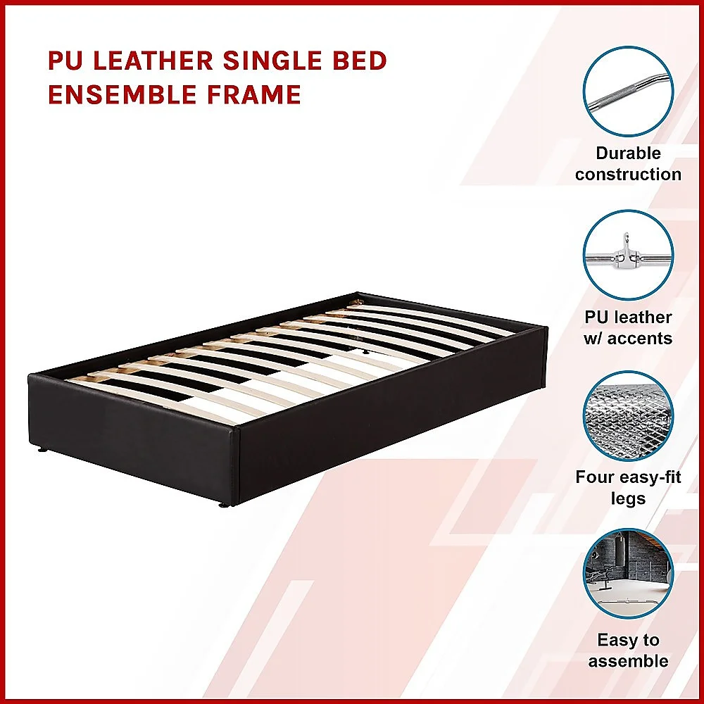Designed for a standard-sized Single mattress, this bed frame features quality craftsmanship and the finest materials. With the brilliant sheen of easy-to-maintain black PU leather and elegant stitching accents, this bed frame fits equally well with both contemporary and classic decórs.