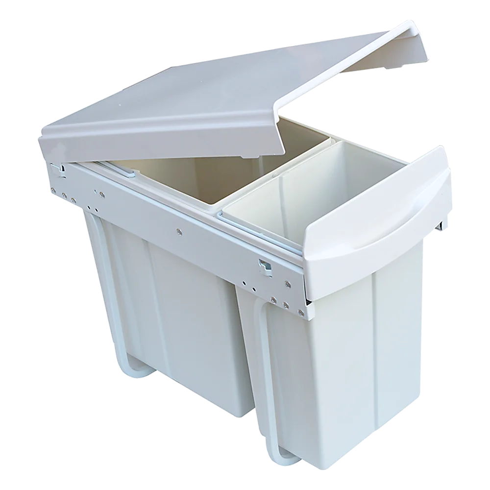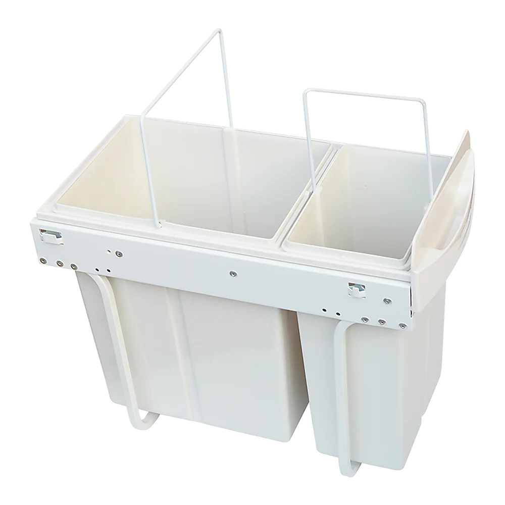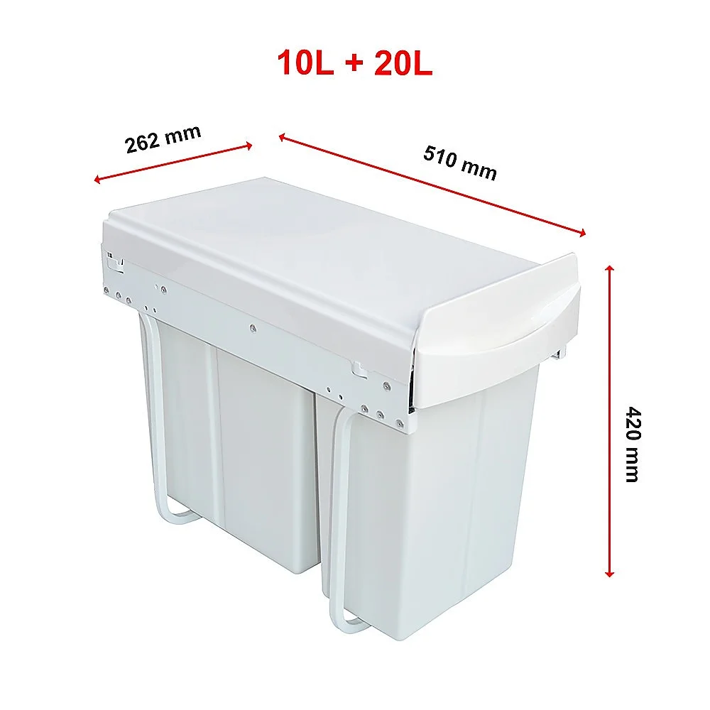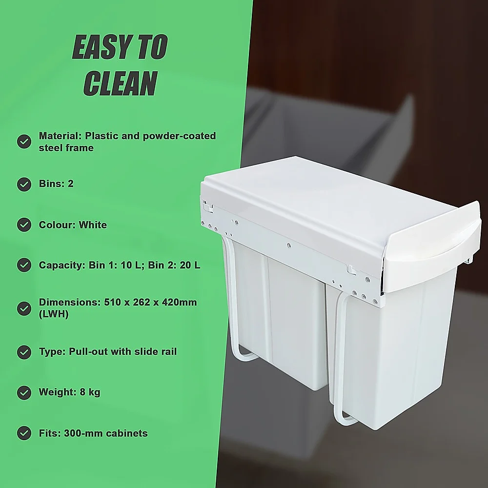This 10-litre plus 20-litre size is perfect for 300-millimetre cabinets. Made from white plastic for easy cleaning, this bin features a metal frame for sturdiness and durability. Two bins allow you to sort your rubbish for recycling or by type.