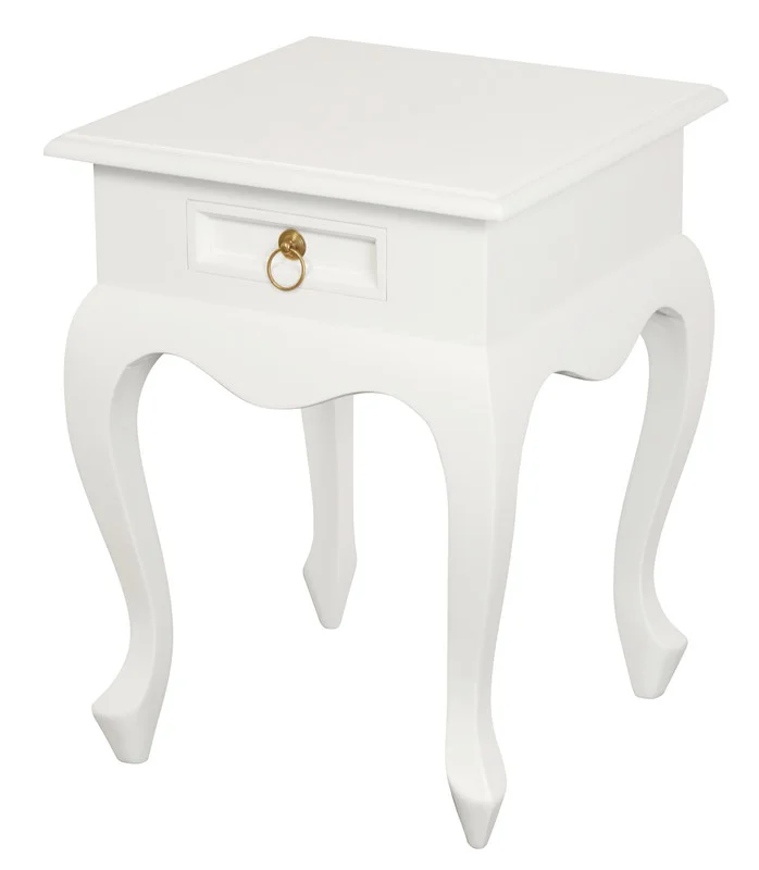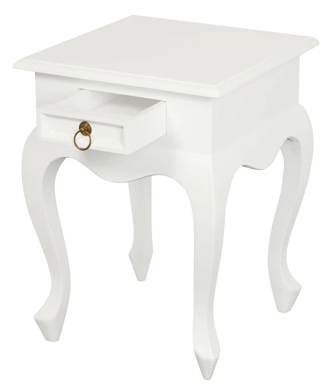 Embrace the sophistication of the Queen Anne 1 Drawer Lamp Tablea piece that pays homage to the elegance of traditional furniture design. Expertly crafted from solid mahogany timber, renowned for its strength and aesthetic appeal, this lamp table is detailed with brass hardware that adds a distinguished touch of luxury. Delivered fully assembled for your convenience, the Queen Anne lamp table measures 45 x 45 x 60 cm, providing an exquisite accent to any space without overwhelming it. Available in a selection of finishesChocolate, Light Pecan, Mahogany, White, and White Carameleach hue is chosen to highlight the natural beauty of the wood and complement your decor. The table's design is inspired by the graceful and romantic forms of the Queen Anne style, characterized by its curved lines and subtle ornamentation. The cabriole legs are a hallmark of the style, lending an air of antique charm and formality. The single drawer offers practical storage, making the table as functional as it is beautiful.