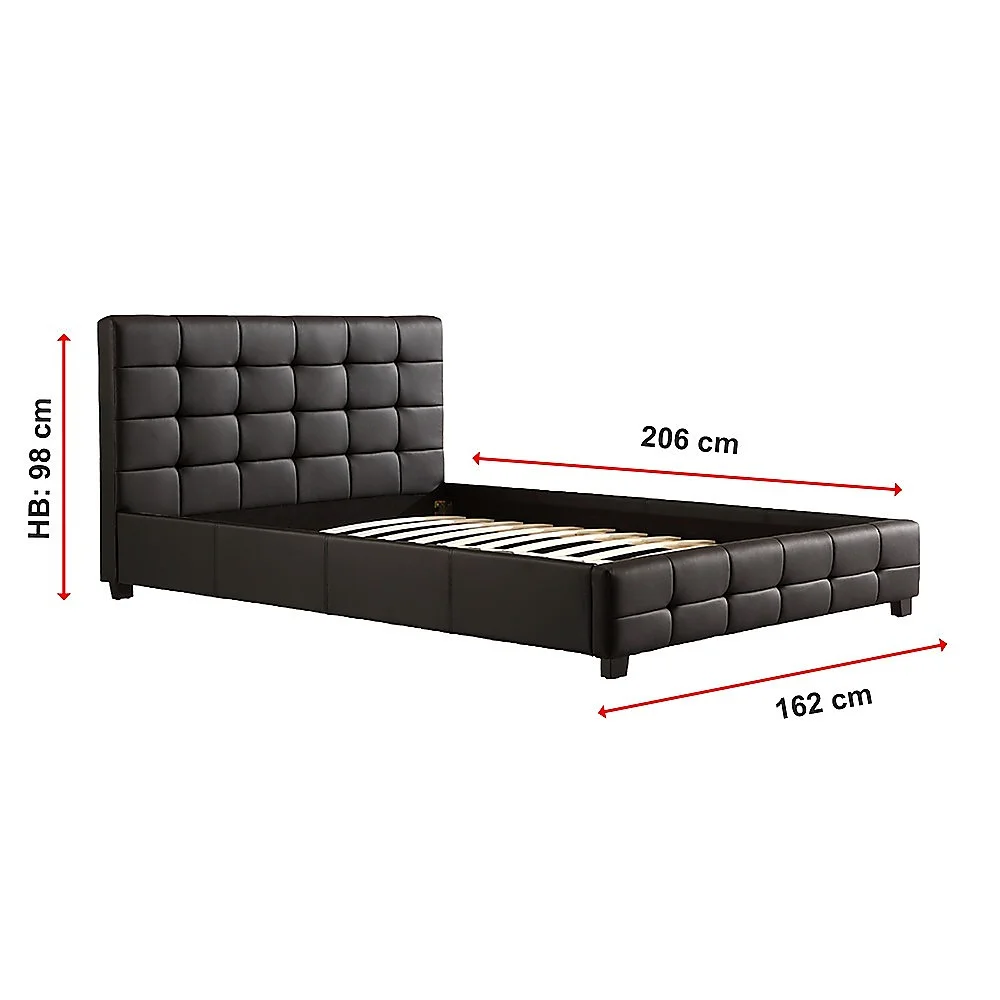 An exceptionally sturdy all-wood frame and support slats provide a rock-solid foundation for your mattress that will surely lead to many restful nights. The PU Leather covering is similarly durable, not to mention easy to clean. The frame is designed to accommodate standard queen-sized mattresses with dimensions of 153 x 203 cm (mattress and linens not included). The headboard is 98 cm tall (6cm leg 92cm headboard) from top to bottom, and the overall dimensions of the bed frame are 206 cm x 162 cm.