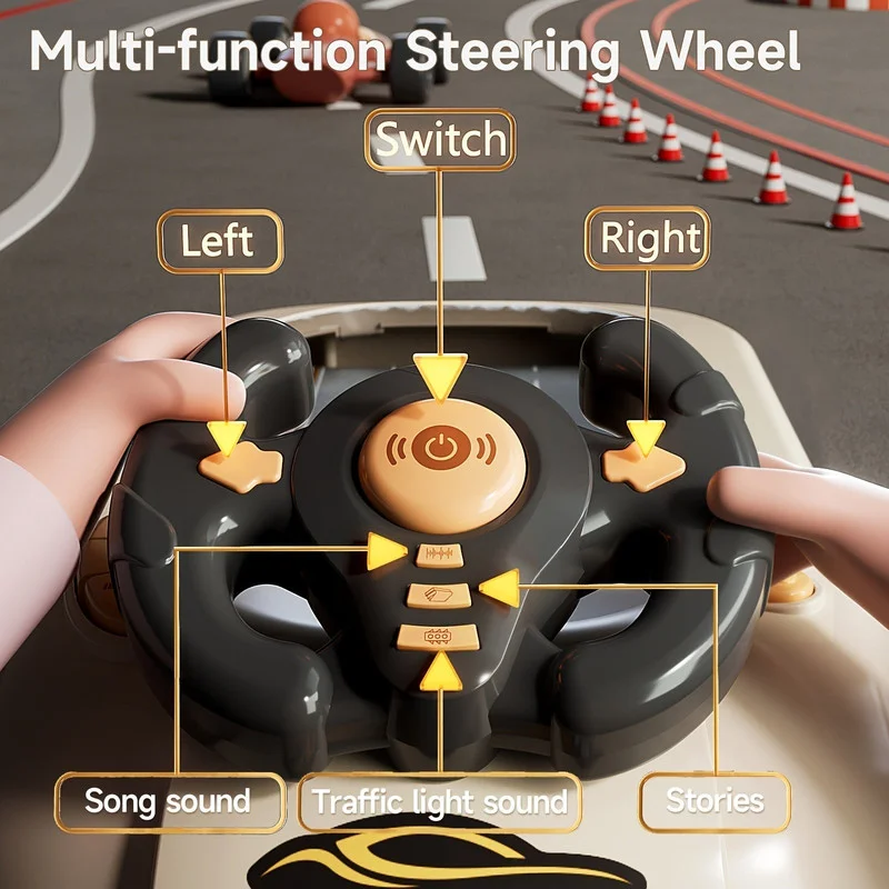 The Racing Steering Wheel Toy offers kids an exciting and interactive driving experience with simulated racing, dodging, and overtaking gameplay. Designed for children aged 3 and up, this crank-operated toy helps develop motor skills and coordination. The toy is made from durable ABS and powered by batteries for continuous fun. Refer to the image for detailed dimensions and scale.
