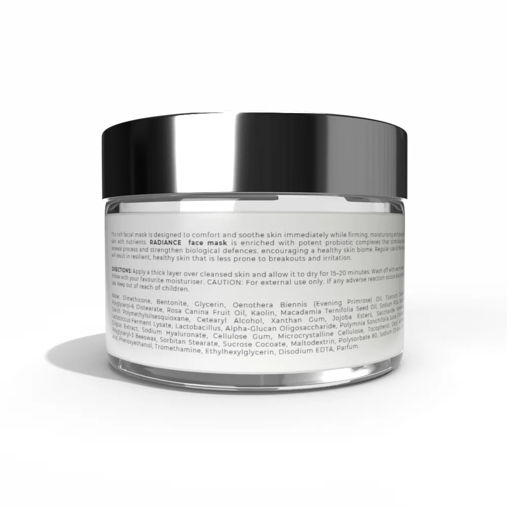 Aqua (Water), Dimethicone, Bentonite,Glycerin, Oenothera Biennis (Evening Primrose) Oil,Titanium Dioxide, Polyglycerol-6 Distearate, Rosa Canina Fruit Oil, Kaolin, Macadamia Ternifolia Seed Oil, Sodium PCA,Tapioca Starch Polymethylsilsesquioxane, Cetearyl Alcohol, Xanthan Gum,Lactobacillus, Chondrus Crispus Extract, Sodium Hyaluronate, Sucrose Cocoate, Jojoba Esters, Sorbitan Stearate, Saccharide Isomerate, Algin, Microcrystalline Cellulose, Cellulose Gum, Polysorbate 80, Tocopherol, Cetyl Alcohol, Citric Acid, Sodium Citrate, Polyglyceryl-3 Beeswax, Potassium Sorbate, Calcium Chloride,Sodium Benzoate , Phenoxyethanol, Ethylhexylglycerin, Disodium EDTA, Tromethamine,Parfum (Fragrance)