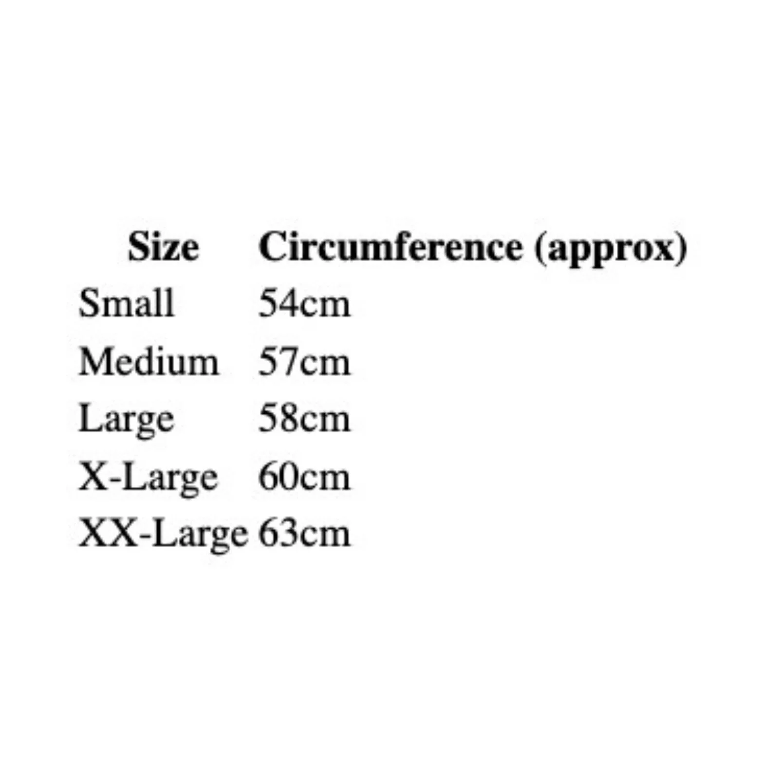 | Size | Circumference (approx) |