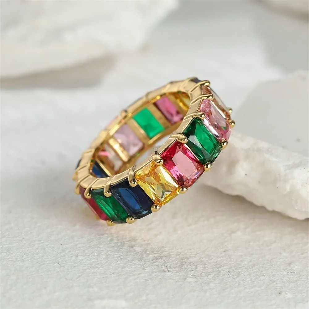 Introducing the Rainbow Ring — a stunning array of women's stainless steel rings adorned with colorful zircon gemstones. Crafted with a flair for contemporary fashion, these rings are designed to shine with every turn. Choose from a variety of color options to suit your style and add a vibrant touch to your jewelry collection.?